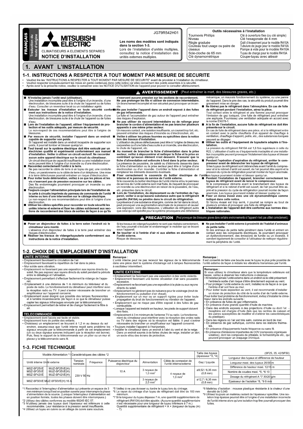 - En présence d’équipements haute fréquence ou sans fil.• En présence d’émissions importantes de COV (composés organiques volatiles), dont les composés de phtalate, le formaldéhyde etc., qui peuvent provoquer un craquage chimique.*1 Raccordez à l’interrupteur d’alimentation qui présente un espace de 3 mm minimum lorsqu’il est en position ouverte pour interrompre la phase d’alimentation de la source. (Lorsque l’interrupteur d’alimentation est en position fermée, toutes les phases doivent être interrompues.)*2 Utilisez des câbles conformes au modèle 60245 IEC 57.*3 N’utilisez jamais des tuyaux dont l’épaisseur est inférieure à celle recommandée. Leur résistance à la pression serait insuffisante.*4 Utilisez un tuyau en cuivre ou en alliage de cuivre sans soudure.*5 Veillez à ne pas écraser ou tordre le tuyau lors du cintrage.*6 Le rayon du cintrage d’un tuyau de réfrigérant doit être de 100 mm minimum.*7 Si la longueur du tuyau dépasse 7 m, une quantité supplémentaire de réfrigérant (R410A) doit être ajoutée. (Aucune quantité supplémentaire n’est nécessaire pour une longueur de tuyau inférieure à 7 m.)Quantité supplémentaire de réfrigérant = A × (longueur de tuyau (m) – 7) *8 Matériau d’isolation : mousse plastique résistante à la chaleur d’une densité de 0,045*9 Utilisez toujours un matériau isolant de l’épaisseur spécifiée. Une iso-lation trop épaisse pourrait être à l’origine d’une installation incorrecte de l’unité interne alors qu’une isolation trop fine pourrait provoquer des fuites.Modèle Alimentation *1 Caractéristiques des câbles *2Taille des tuyaux(épaisseur *3, *4)Unité interne Unité externeTensionnominaleFréquencePuissance électrique du disjoncteurAlimentationCâble de connexion de l’unité interne/externeGaz / LiquideMSZ-SF25VEMSZ-SF35VEMSZ-SF42VEMUZ-SF25VE(H)MUZ-SF35VE(H)MUZ-SF42VE(H)230 V 50 Hz 10 A 3 noyaux de 1,0 mm 4 noyaux de 1,0 mm ø9,52 / 6,35 mm(0,8 mm)MSZ-SF50VE MUZ-SF50VE(H) 16 A3 noyaux de 2,0 mm ø12,7 / 6,35 mm(0,8 mm)(SF25, 35, 42/SF50)Longueur des tuyaux et différence de hauteurLongueur maxi. des tuyaux 20/30 mDifférence de hauteur maxi. 12/15 mNombre de coudes maxi. *5, *6 10Dosage du réfrigérant A *7 30/20 g/mEpaisseur de l’isolation *8, *9 8 mm