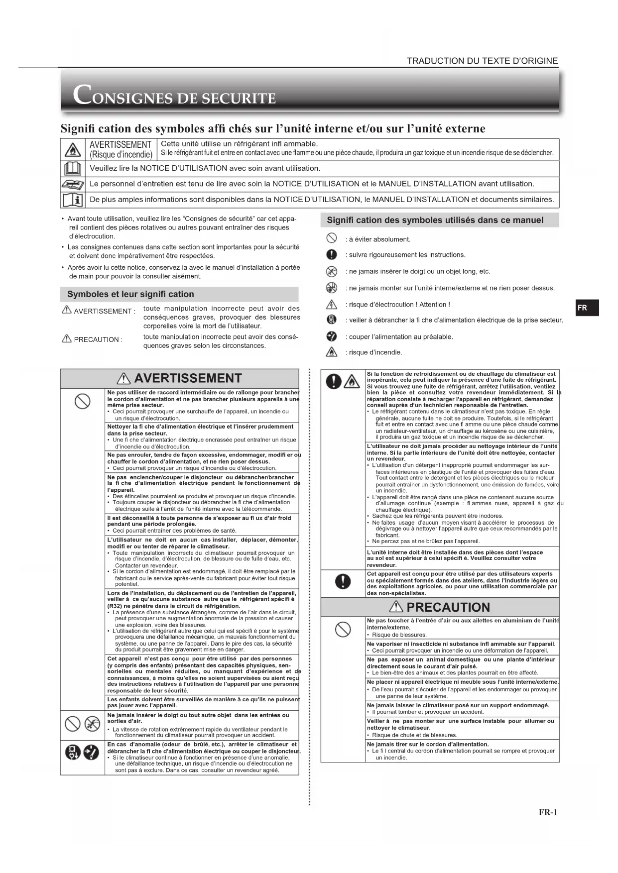 - Avant toute utilisation, veuillez lire les “Consignes de sécurité” car cet appa-reil contient des pièces rotatives ou autres pouvant entraîner des risques d’électrocution.• Les consignes contenues dans cette section sont importantes pour la sécurité et doivent donc impérativement être respectées.• Après avoir lu cette notice, conservez-la avec le manuel d’installation à portée de main pour pouvoir la consulter aisément. Symboles et leur signifi cation AVERTISSEMENT :toute manipulation incorrecte peut avoir des conséquences graves, provoquer des blessures corporelles voire la mort de l’utilisateur. PRECAUTION :toute manipulation incorrecte peut avoir des consé-quences graves selon les circonstances. Signifi cation des symboles utilisés dans ce manuel : à éviter absolument. : suivre rigoureusement les instructions. : ne jamais insérer le doigt ou un objet long, etc. : ne jamais monter sur l’unité interne/externe et ne rien poser dessus. : risque d’électrocution ! Attention ! veiller à débrancher la fi che d’alimentation électrique de la prise secteur. : couper l’alimentation au préalable. : risque d’incendie. Signifi cation des symboles affi chés sur l’unité interne et/ou sur l’unité externe AVERTISSEMENT (Risque d’incendie) Cette unité utilise un réfrigérant infl ammable. Si le réfrigérant fuit et entre en contact avec une fl amme ou une pièce chaude, il produira un gaz toxique et un incendie risque de se déclencher. Veuillez lire la NOTICE D’UTILISATION avec soin avant utilisation. Le personnel d’entretien est tenu de lire avec soin la NOTICE D’UTILISATION et le MANUEL D’INSTALLATION avant utilisation. De plus amples informations sont disponibles dans la NOTICE D’UTILISATION, le MANUEL D’INSTALLATION et documents similaires. AVERTISSEMENT Ne pas utiliser de raccord intermédiaire ou de rallonge pour brancher le cordon d’alimentation et ne pas brancher plusieurs appareils à une même prise secteur.• Ceci pourrait provoquer une surchauffe de l’appareil, un incendie ou un risque d’électrocution.Nettoyer la fi che d’alimentation électrique et l’insérer prudemment dans la prise secteur.• Une fi che d’alimentation électrique encrassée peut entraîner un risque d’incendie ou d’électrocution.Ne pas enrouler, tendre de façon excessive, endommager, modifi er ou chauffer le cordon d’alimentation, et ne rien poser dessus.• Ceci pourrait provoquer un risque d’incendie ou d’électrocution.Ne pas enclencher/couper le disjoncteur ou débrancher/brancher la fi che d’alimentation électrique pendant le fonctionnement de l’appareil.• Des étincelles pourraient se produire et provoquer un risque d’incendie.• Toujours couper le disjoncteur ou débrancher la fi che d’alimentation électrique suite à l’arrêt de l’unité interne avec la télécommande. Il est déconseillé à toute personne de s’exposer au fl ux d’air froid pendant une période prolongée.• Ceci pourrait entraîner des problèmes de santé.L’utilisateur ne doit en aucun cas installer, déplacer, démonter, modifi er ou tenter de réparer le climatiseur.• Toute manipulation incorrecte du climatiseur pourrait provoquer un risque d’incendie, d’électrocution, de blessure ou de fuite d’eau, etc. Contacter un revendeur.• Si le cordon d’alimentation est endommagé, il doit être remplacé par le fabricant ou le service après-vente du fabricant pour éviter tout risque potentiel.Lors de l’installation, du déplacement ou de l’entretien de l’appareil, veiller à ce qu’aucune substance autre que le réfrigérant spécifi é (R32) ne pénètre dans le circuit de réfrigération.• La présence d’une substance étrangère, comme de l’air dans le circuit, peut provoquer une augmentation anormale de la pression et causer une explosion, voire des blessures. • L’utilisation de réfrigérant autre que celui qui est spécifi é pour le système provoquera une défaillance mécanique, un mauvais fonctionnement du système, ou une panne de l’appareil. Dans le pire des cas, la sécurité du produit pourrait être gravement mise en danger.Cet appareil n’est pas conçu pour être utilisé par des personnes (y compris des enfants) présentant des capacités physiques, sen-sorielles ou mentales réduites, ou manquant d’expérience et de connaissances, à moins qu’elles ne soient supervisées ou aient reçu des instructions relatives à l’utilisation de l’appareil par une personne responsable de leur sécurité.Les enfants doivent être surveillés de manière à ce qu’ils ne puissent pas jouer avec l’appareil. Ne jamais insérer le doigt ou tout autre objet dans les entrées ou sorties d’air.• La vitesse de rotation extrêmement rapide du ventilateur pendant le fonctionnement du climatiseur pourrait provoquer un accident. En cas d’anomalie (odeur de brûlé, etc.), arrêter le climatiseur et débrancher la fi che d’alimentation électrique ou couper le disjoncteur.• Si le climatiseur continue à fonctionner en présence d’une anomalie, une défaillance technique, un risque d’incendie ou d’électrocution ne sont pas à exclure. Dans ce cas, consulter un revendeur agréé. Si la fonction de refroidissement ou de chauffage du climatiseur est inopérante, cela peut indiquer la présence d’une fuite de réfrigérant. Si vous trouvez une fuite de réfrigérant, arrêtez l’utilisation, ventilez bien la pièce et consultez votre revendeur immédiatement. Si la réparation consiste à recharger l’appareil en réfrigérant, demandez conseil auprès d’un technicien responsable de l’entretien.• Le réfrigérant contenu dans le climatiseur n’est pas toxique. En règle générale, aucune fuite ne doit se produire. Toutefois, si le réfrigérant fuit et entre en contact avec une fl amme ou une pièce chaude comme un radiateur-ventilateur, un chauffage au kérosène ou 