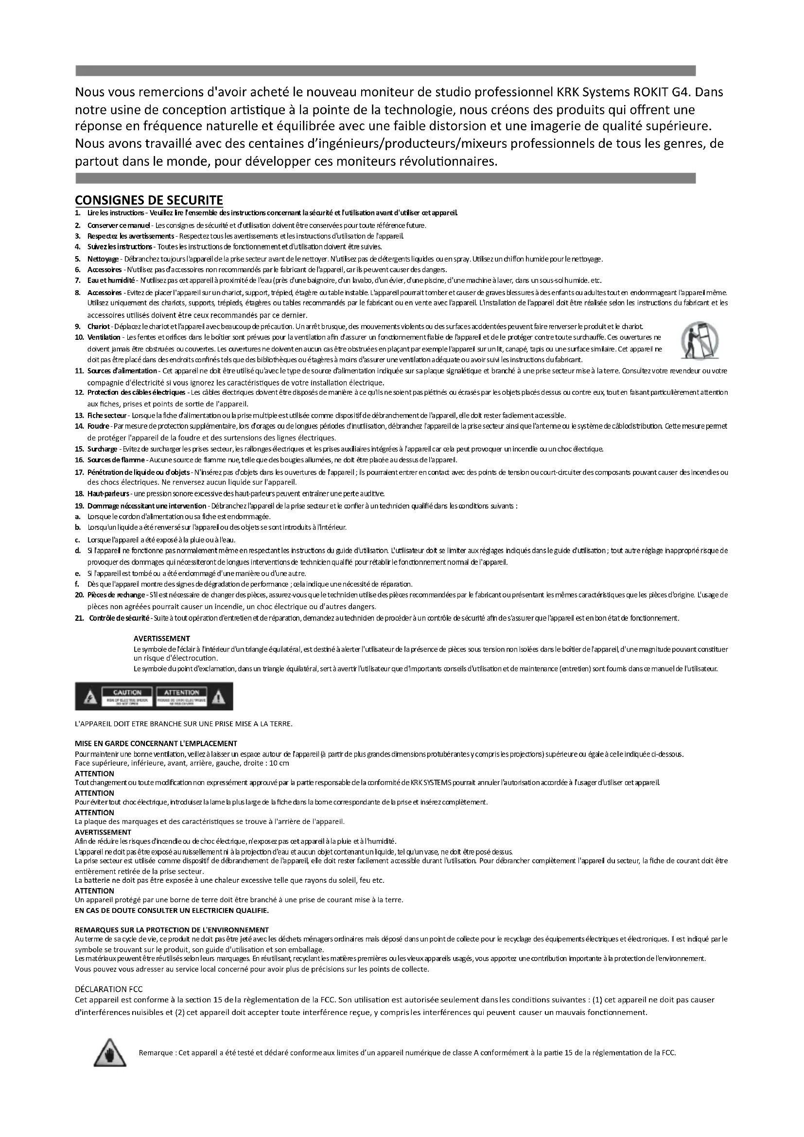 Pour maintenir une bonne ventilation, veillez à laisser un espace autour de l'appareil (à partir de plus grandes dimensions protubérantes y compris les projections) supérieure ou égale à celle indiquée ci-dessous. Face supérieure, inférieure, avant, arrière, gauche, droite : 10 cm ATTENTION Tout changement ou toute modification non expressément approuvé par la partie responsable de la conformité de KRK SYSTEMS pourrait annuler l'autorisation accordée à l'usager d'utiliser cet appareil. ATTENTION Pour éviter tout choc électrique, introduisez la lame la plus large de la fiche dans la borne correspondante de la prise et insérez complètement. ATTENTION La plaque des marquages et des caractéristiques se trouve à l'arrière de l'appareil. AVERTISSEMENT Afin de réduire les risques d'incendie ou de choc électrique, n'exposez pas cet appareil à la pluie et à l'humidité. L'appareil ne doit pas être exposé au ruissellement ni à la projection d'eau et aucun objet contenant un liquide, tel qu'un vase, ne doit être posé dessus. La prise secteur est utilisée comme dispositif de débranchement de l'appareil, elle doit rester facilement accessible durant l'utilisation. Pour débrancher complètement l'appareil du secteur, la fiche de courant doit être entièrement retirée de la prise secteur. La batterie ne doit pas être exposée à une chaleur excessive telle que rayons du soleil, feu etc. ATTENTION Un appareil protégé par une borne de terre doit être branché à une prise de courant mise à la terre. EN CAS DE DOUTE CONSULTER UN ELECTRICIEN QUALIFIE.