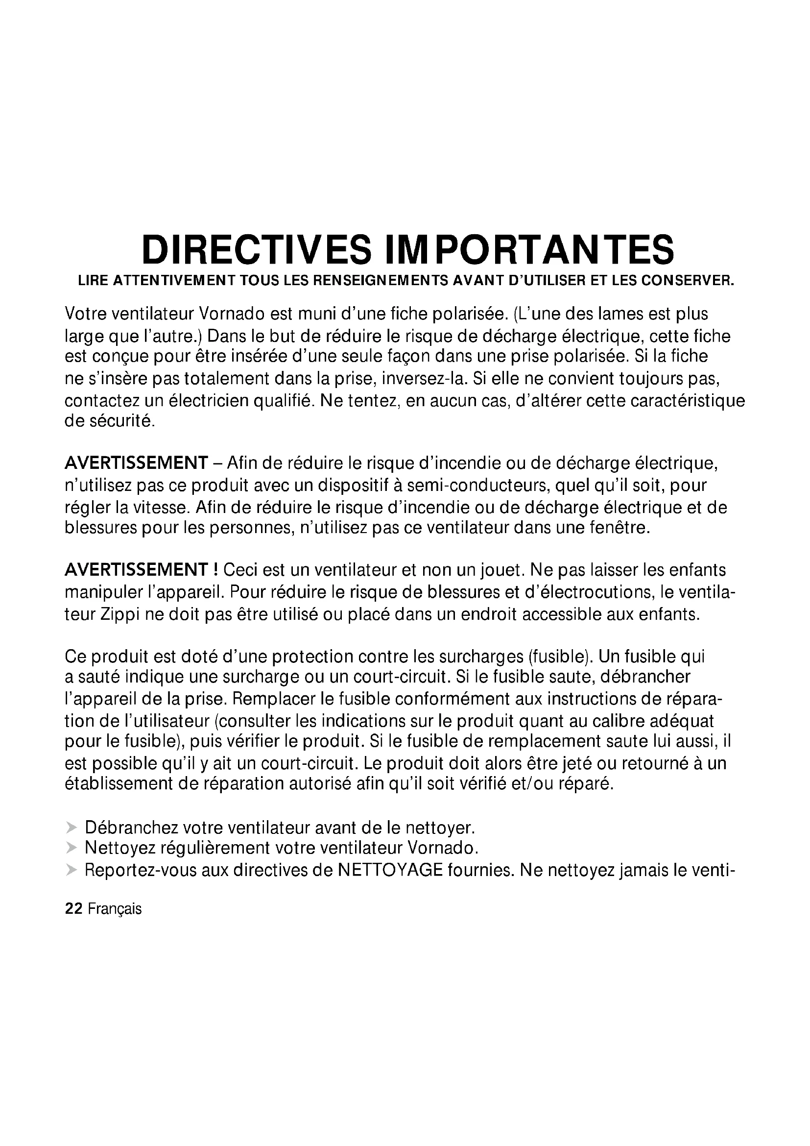 - Garantie Table Des Matières22 Français DIRECTIVES IMPORTANTES LIRE ATTENTIVEMENT TOUS LES RENSEIGNEMENTS AVANT D’UTILISER ET LES CONSERVER. Votre ventilateur Vornado est muni d’une fiche polarisée. (L’une des lames est plus large que l’autre.) Dans le but de réduire le risque de décharge électrique, cette fiche est conçue pour être insérée d’une seule façon dans une prise polarisée. Si la fiche ne s’insère pas totalement dans la prise, inversez-la. Si elle ne convient toujours pas, contactez un électricien qualifié. Ne tentez, en aucun cas, d’altérer cette caractéristique de sécurité. AVERTISSEMENT – Afin de réduire le risque d’incendie ou de décharge électrique, n’utilisez pas ce produit avec un dispositif à semi-conducteurs, quel qu’il soit, pour régler la vitesse. Afin de réduire le risque d’incendie ou de décharge électrique et de blessures pour les personnes, n’utilisez pas ce ventilateur dans une fenêtre. AVERTISSEMENT ! Ceci est un ventilateur et non un jouet. Ne pas laisser les enfants manipuler l’appareil. Pour réduire le risque de blessures et d’électrocutions, le ventila- teur Zippi ne doit pas être utilisé ou placé dans un endroit accessible aux enfants. Ce produit est doté d’une protection contre les surcharges (fusible). Un fusible qui a sauté indique une surcharge ou un court-circuit. Si le fusible saute, débrancher l’appareil de la prise. Remplacer le fusible conformément aux instructions de répara- tion de l’utilisateur (consulter les indications sur le produit quant au calibre adéquat pour le fusible), puis vérifier le produit. Si le fusible de remplacement saute lui aussi, il est possible qu’il y ait un court-circuit. Le produit doit alors être jeté ou retourné à un établissement de réparation autorisé afin qu’il soit vérifié et/ou réparé. p. 28