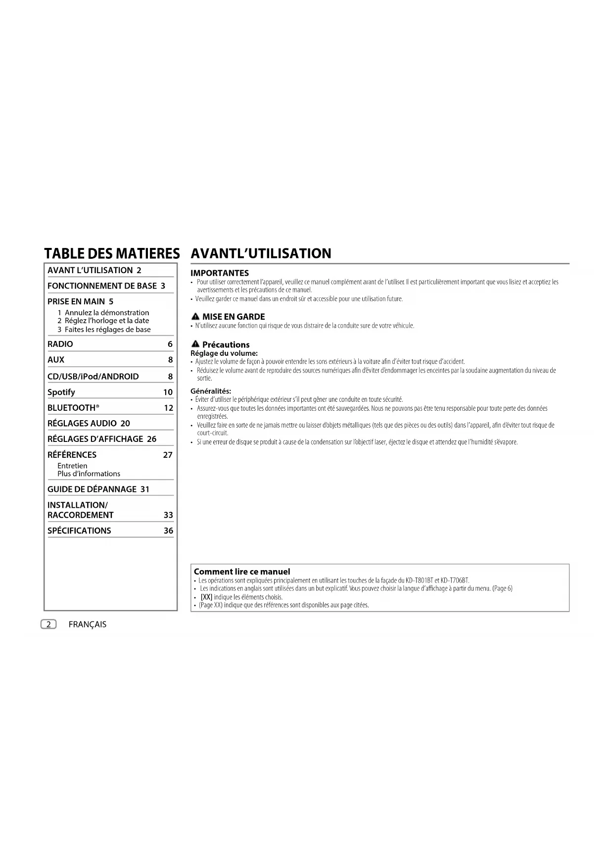 - Si aucune information n’est disponible ou si aucune information n’est enregistrée, “NO TEXT”, “NO NAME”, ou une autre information (par ex. le nom de la station) apparaît ou l’affichage est vide. KD-T801BT/KD-T709BT: *1 La date sera remplacée par la batterie et la puissance du signal du périphérique Bluetooth connecté si [FORMAT] est réglé sur [BATT/SIGNAL]. (Page26) Nom de la source Informations sur l’affichage: Principal (supplémentaire) FM ou AM Fréquence (Date) Fréquence (Date) avec effet de synchronisation musicale*2 retour au début Pour les stations FM Radio Data System uniquement: Nom de la station/Type de programme (Date) Nom de station/Type de programme (Date) avec effet de synchronisation musicale*2 Radio texte (Date) Radio texte+ (Radio texte+) Titre de morceau (Artiste) Titre de morceau (Date) Fréquence (Date) retour au début Nom de la source Informations sur l’affichage: Principal (supplémentaire) CD ou USB Pour CD-DA: Titre de plage (Artiste) Titre de plage (Artiste) avec effet de synchronisation musicale*2 Titre de plage (Titre du disque) Titre de plage (Date) Durée de lecture (Date) retour au début Pour les fichiers MP3/WMA/AAC/WAV/FLAC: Titre de morceau (Artiste) Titre de morceau (Artiste) avec effet de synchronisation musicale*2 Titre de morceau (Titre d’album) Titre de morceau (Date) Nom de fichier (Nom de dossier) Nom de fichier (Date) Durée de lecture (Date) retour au début iPodUSB/iPodBT Quand [HEAD MODE] est sélectionné (page9): Titre de morceau (Artiste) Titre de morceau (Artiste) avec effet de synchronisation musicale*2 Titre de morceau (Titre d’album) Titre de morceau (Date) Durée de lecture (Date) retour au début ANDROID Nom de la source (Date) Nom de la source (Date) avec effet de synchronisation musicale*2 retour au début SPOTIFY/SPOTIFYBT Titre contextuel (Date) Titre contextuel (Date) avec effet de synchronisation musicale*2 Titre de morceau (Artiste) Titre de morceau (Titre d’album) Titre de morceau (Date) Durée de lecture (Date) retour au début BT AUDIO Titre de morceau (Artiste) Titre de morceau (Artiste) avec effet de synchronisation musicale*2 Titre de morceau (Titre d’album) Titre de morceau (Date) Durée de lecture (Date) retour au début AUX Nom de la source (Date) Nom de la source (Date) avec effet de synchronisation musicale*2 retour au début *2 Pendant l’effet de synchronisation musicale, la couleur de l’éclairage ou le niveau de luminosité de la touche symbolique change et est synchronisé avec le niveau de la musique (en fonction du réglage de la couleur réalisé pour [PRESET] à la page27). Affichage principal Affichage de l’horloge ou Indicateur de niveau Affichage supplémentaire*1 JS_JVC_KD_T801BT_E_FR.indd 29JS_JVC_KD_T801BT_E_FR.indd 29 18/6/2018 1:58:53 PM18/6/2018 1:58:53 PM30 FRANÇAIS Data Size: B6L (182 mm x 128 mm) Book Size: B6L (182 mm x 128 mm)