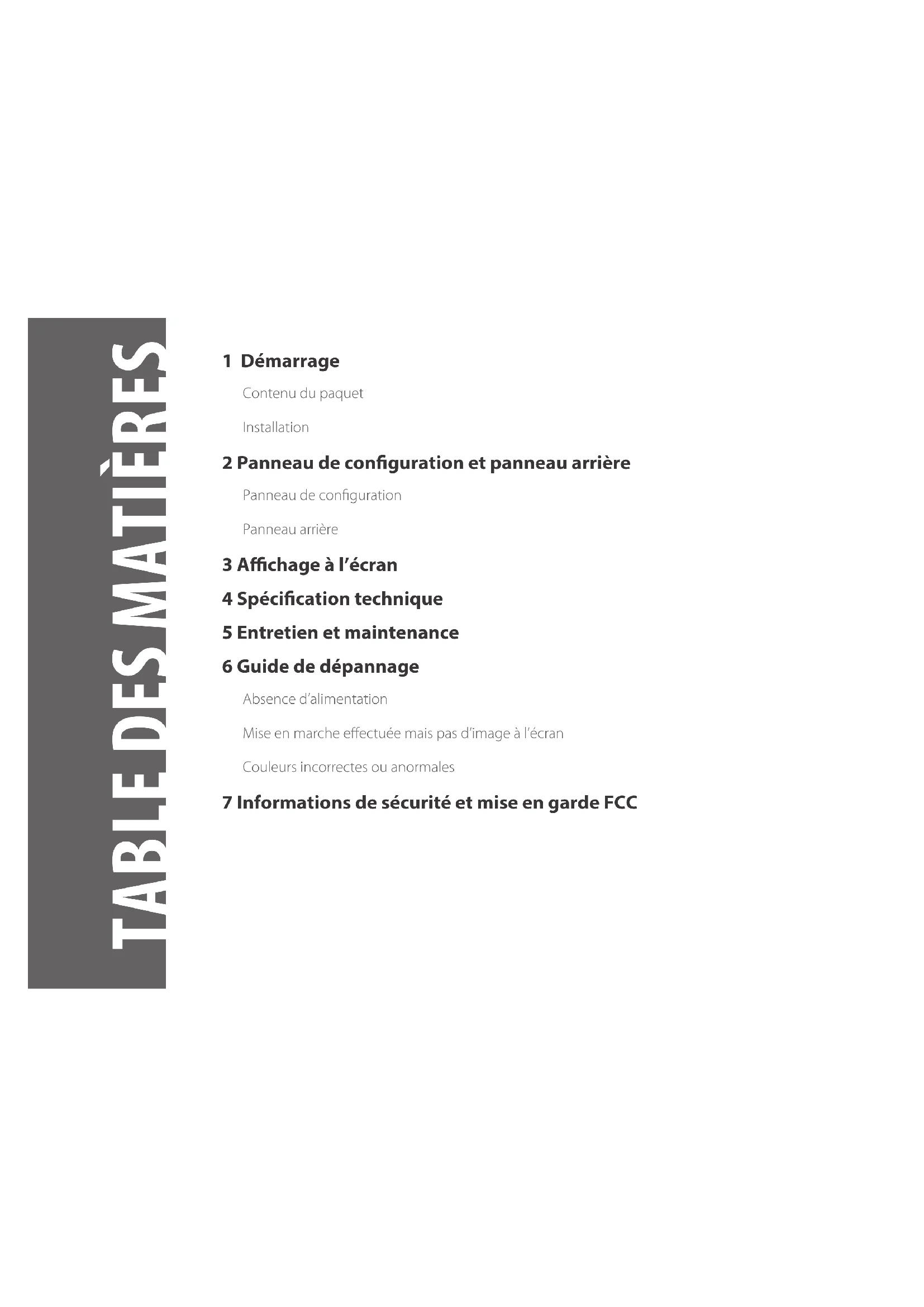 - Ne jamais essayer de réparer votre moniteur vous-même. Faites toujours appel à votre centre d’entretien ou à un technicien qualié pour le faire.GUIDE DE DÉPANNAGE