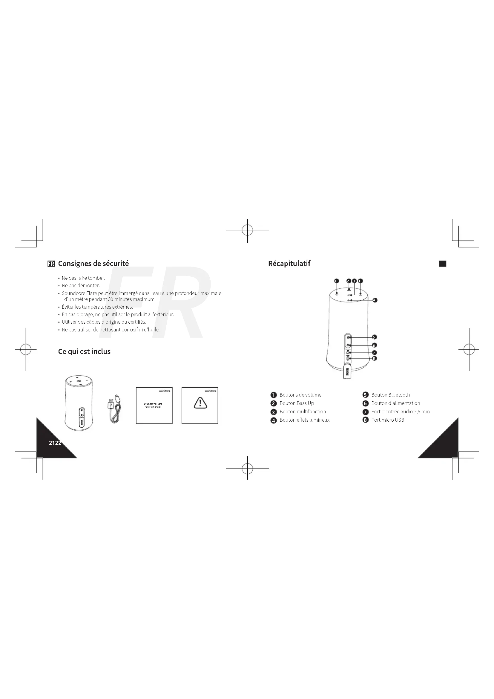 - Ne pas utiliser de nettoyant corrosif ni d'huile. Ce qui est inclus Soundcore FlareUser's manual Récapitulatif