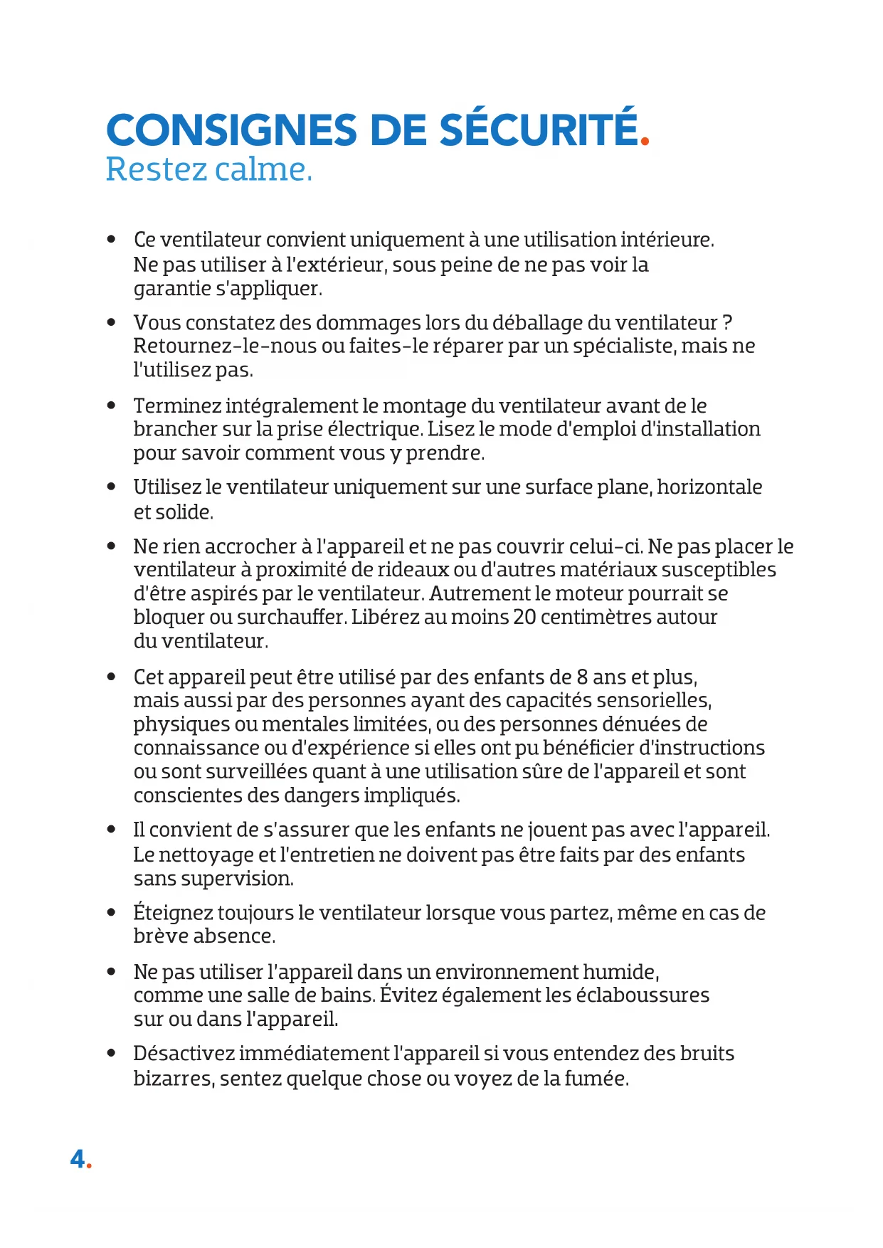 - Vous constatez des dommages lors du déballage du ventilateur ? Retournez-le-nous ou faites-le réparer par un spécialiste, mais ne l’utilisez pas.