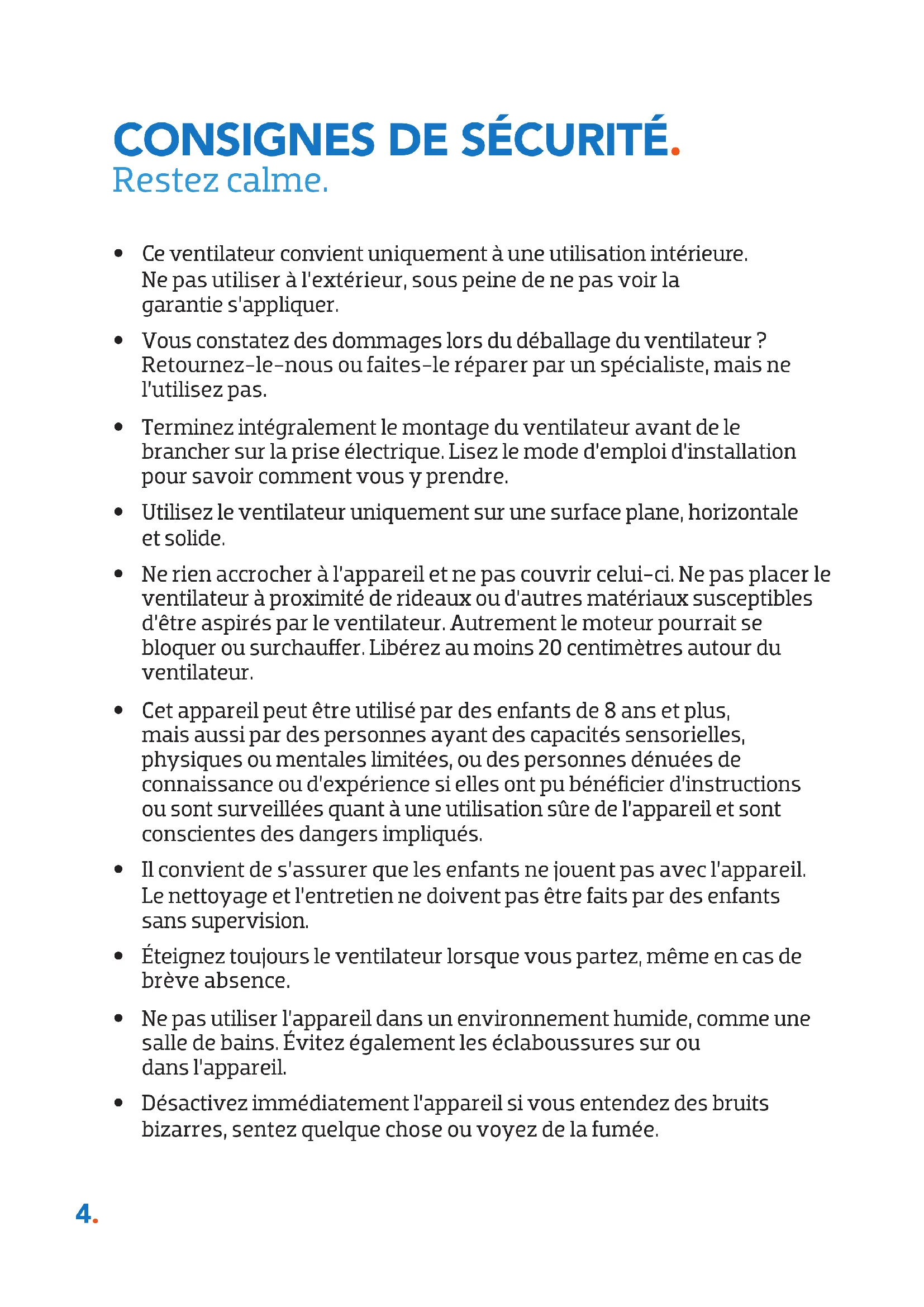 - Vous constatez des dommages lors du déballage du ventilateur ? Retournez-le-nous ou faites-le réparer par un spécialiste, mais ne l’utilisez pas.
