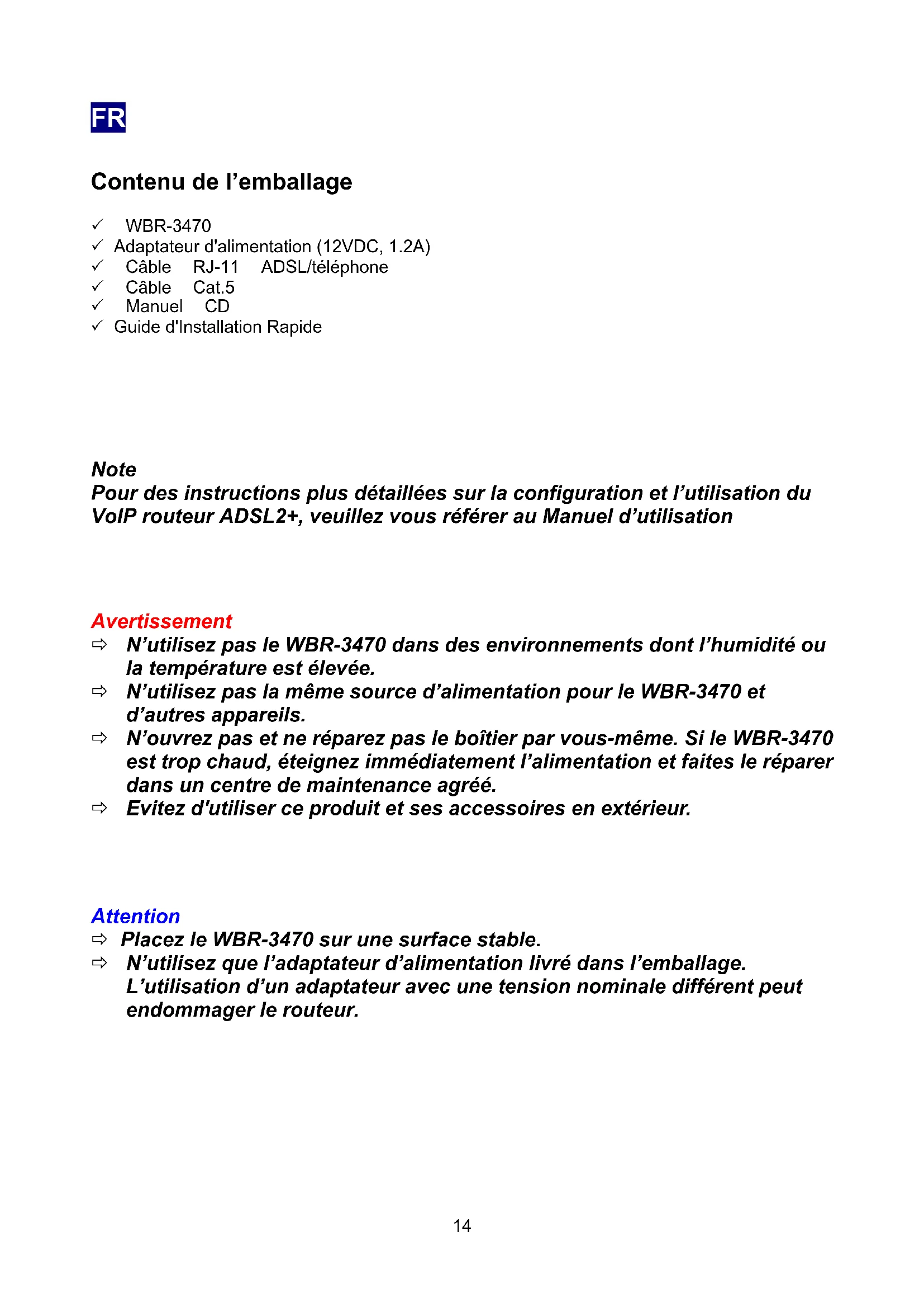 13FR Contenu de l’emballage 3 WBR-3470 3 Adaptateur d'alimentation (12VDC, 1.2A) 3 Câble RJ-11 ADSL/téléphone 3 Câble Cat.5 3 Manuel CD 3 Guide d'Installation Rapide