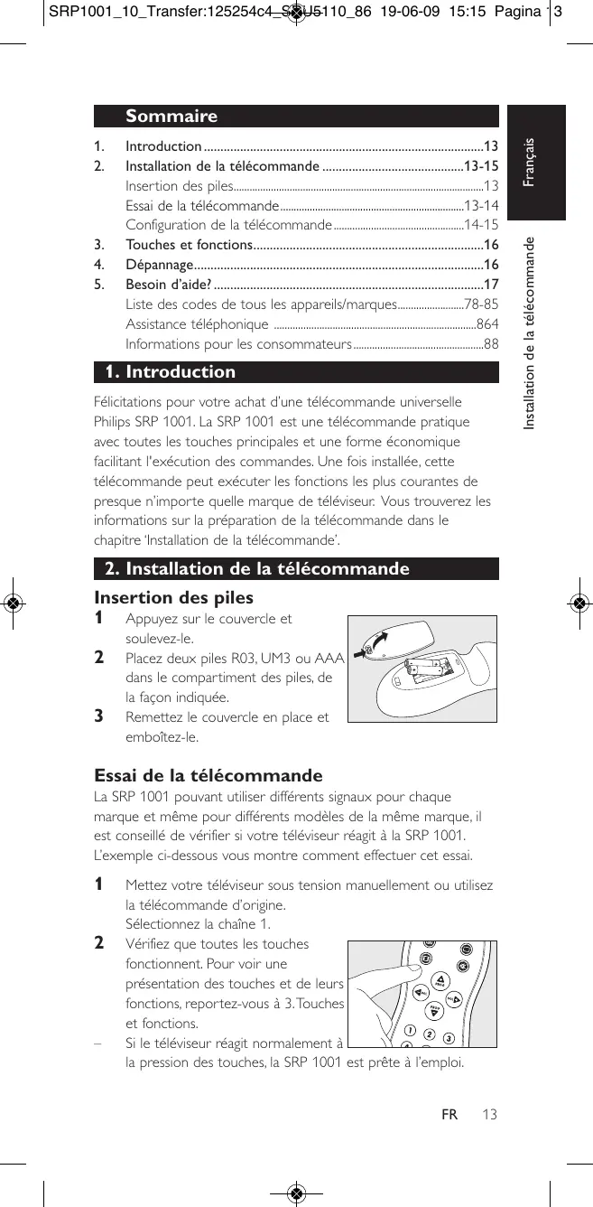 Introduction 13 Installation de la télécommande 13-15 Insertion des piles13 Essai de la télécommande13-14 Configuration de la télécommande 14-15 Touches et fonctions16 Dépannage16 Besoin d’aide? 17 Liste des codes de tous les appareils/marques78-85 Assistance téléphonique 864 Informations pour les consommateurs 88