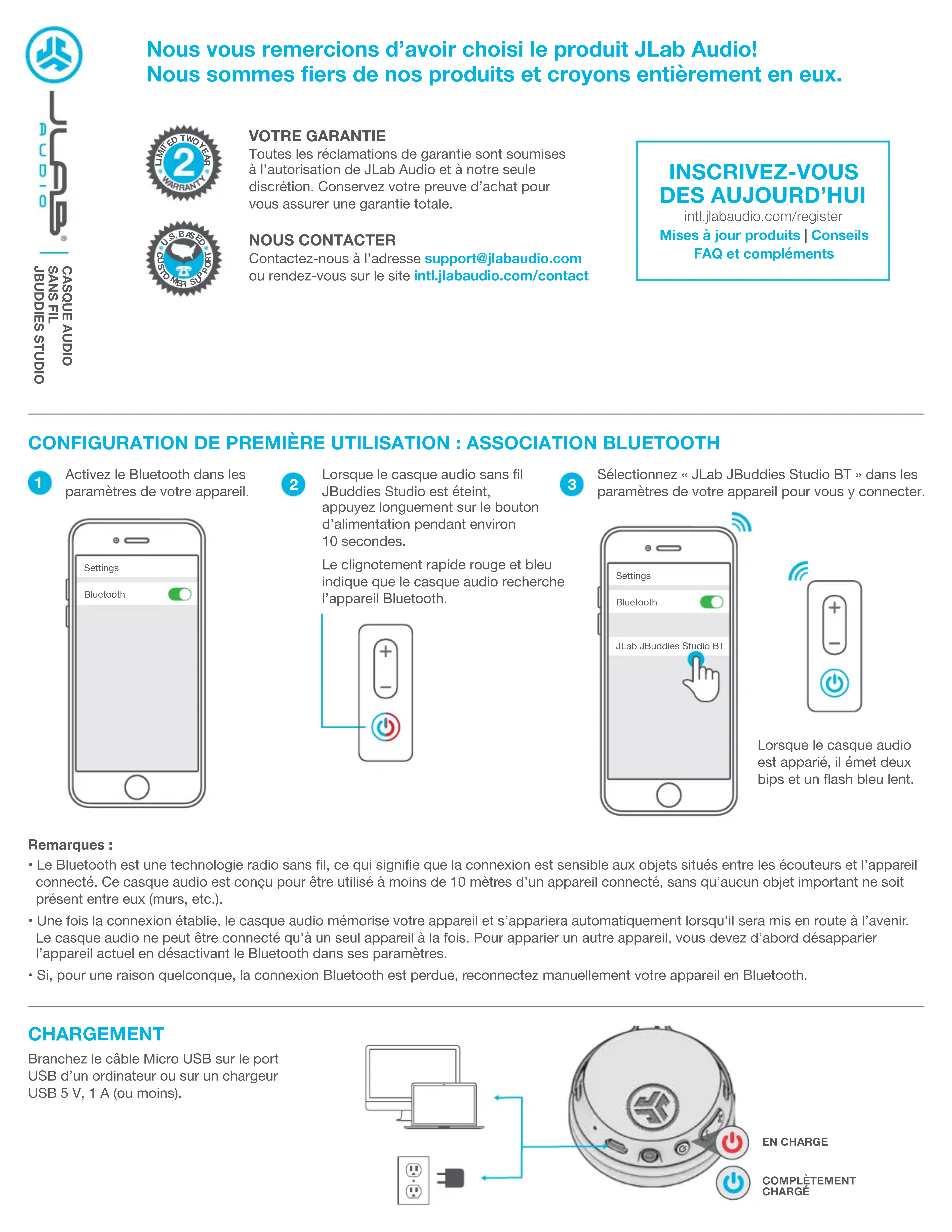 Nous vous remercions d'avoir besoin le produit JLab Audio! Nous sommes fiers de nos produits et croyons entièrement en eux.