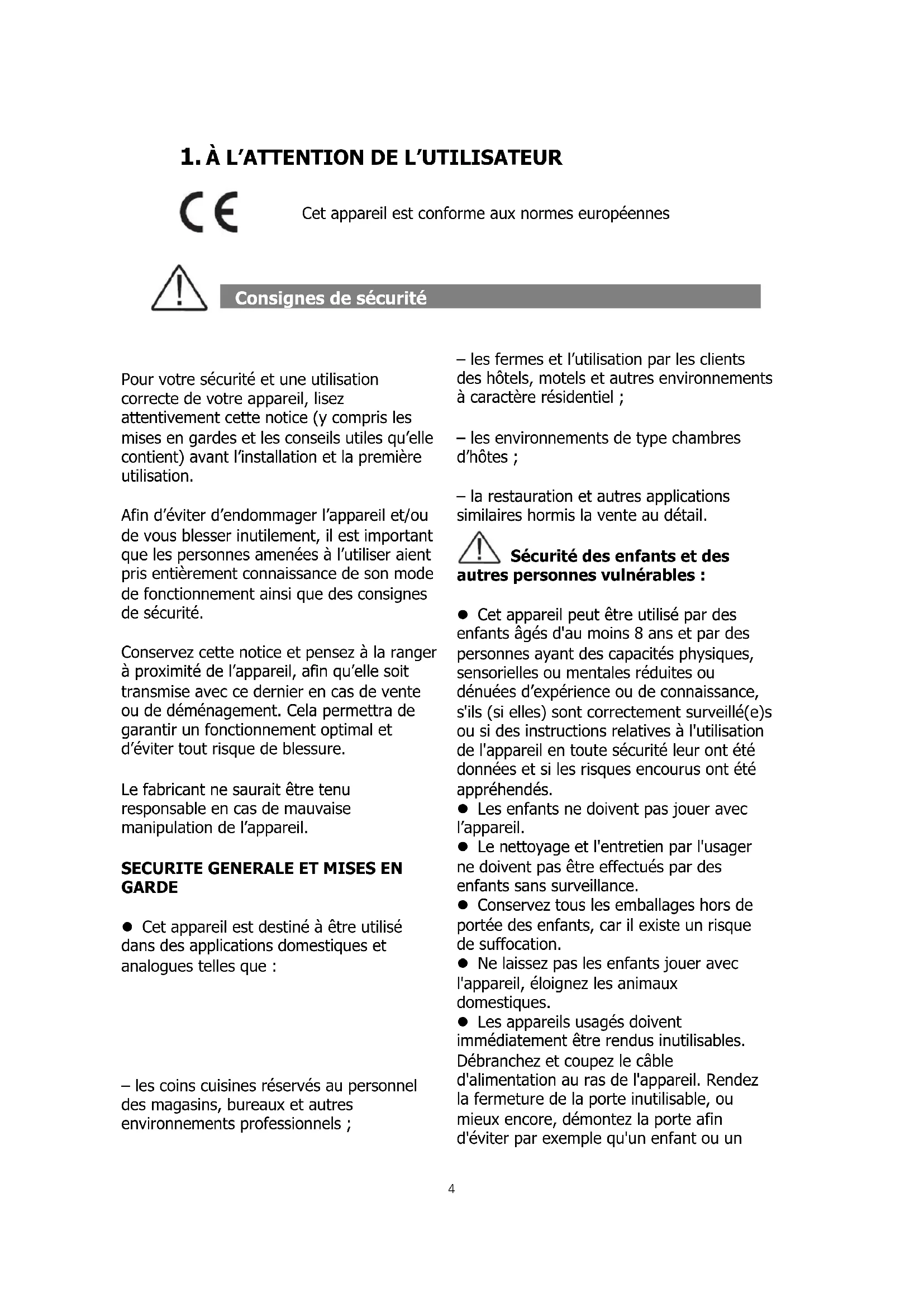 Cet appareil est conforme aux normes européennes Consignes de sécurité
