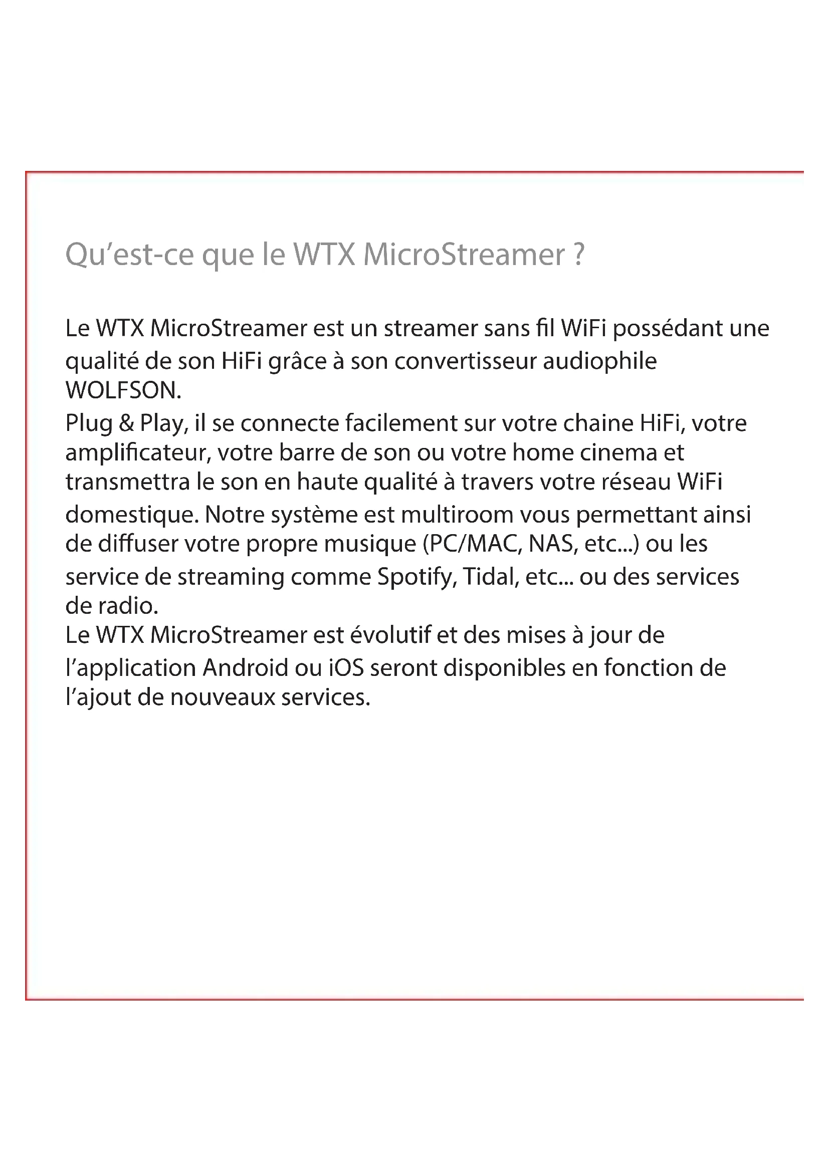 WTX MicroStream 1er Streamer Audiophile multiroom Plug & PlayLe WTX MicroStreamer est un streamer sans l WiFi possédant une qualité de son HiFi grâce à son convertisseur audiophile WOLFSON. Plug & Play, il se connecte facilement sur votre chaine HiFi, votre amplicateur, votre barre de son ou votre home cinema et transmettra le son en haute qualité à travers votre réseau WiFi domestique. Notre système est multiroom vous permettant ainsi de diuser votre propre musique (PC/MAC, NAS, etc...) ou les service de streaming comme Spotify, Tidal, etc... ou des services de radio. Le WTX MicroStreamer est évolutif et des mises à jour de l’application Android ou iOS seront disponibles en fonction de l’ajout de nouveaux services. Qu’est-ce que le WTX MicroStreamer ?Ce que vous devez trouver dans la boite - Le WTX MicroStream x1 - Le transformateur x1 - La prise EC (Europe) x1 - La prise UK x1 - La prise US x1L’ interface Bouton WPS pour appairage Led Prise alim. Canal gauche Canal droit Connecteurs RCATélécharger l’application Android ou iOS - Pour contrôler votre WTX MicroStreamer, vous devez télécharger sur l’App Store (Apple) ou sur Google Play (Android) l’application Advance Playstream. Advance Playstream est le nom de l’applicationConnecter votre WTX MicroStreamer à l’aide du WPS - Assurez-vous que le Wi de votre smartphone ou tablette est activé sur votre réseau domestique - Lancer l’application ADVANCE PLAYSTREAM et suivez les instructions. Vous devez taper le mot de passe de votre routeur dans l’application Advance Playstream - Appuyez sur le bouton WPS du WTX MicroStreamerOu se connecter manuellement - Aller dans les réglages généraux de votre smartphone WiFi (WLAN) - Connectez vous au WTX MicroStreamer - Entrez l’adresse http://10.10.10.254 dans votre browser et ouvrez l’interface de contrôle. - Choisir WiFi > votre router WiFi > entrer votre mot de passe et la connection s’opère.Réglages du streaming multiroom - L’application Advance Playstream vous permet de choisir dans quelles pièces vous souhaitez transmettre votre musique. De nombreuses combinaisons sont possibles. Musiques identiques ou pas dans une ou plusieurs pièces. - Activer une zone: Sélectionner le WTX choisi en maintenant le doigt puis faites glisser vers le haut d’un autre WTX que vous souhaitez associer. - Désactiver une zone: Sélectionner le WTX que vous souhaitez supprimer et faites le glisser sur l’espace blanc.L’application contrôle votre WTX MicroStreamer L’application contrôle les fonctions de multiroom, multicanaux, réglages, renommage des WTX, des infos des HPs, des mots de passe, langues, timer, alarme et 6 listes de lecture. Ajouter un nouveau WTX Rafraichir l’écran Réglages Choisir L+R (stereo) ou L (gauche) or R (Droit)) Choisir L+R (stereo) ou L (Gauche) or R (Droit) Réglages WTX 1 WTX 2 Lecture/Pause TOUSMenu lecture Lorsqu’un morceau de musique est en lecture, vous avez accés aux informations ci-dessous: Source active Pochette Favoris Zone (pièce) Faire glisser pour accéder à la liste de lecture Listes de lecture Barre de progression Volume Suivant Lecture/Pause Continu PrécédentVos sources