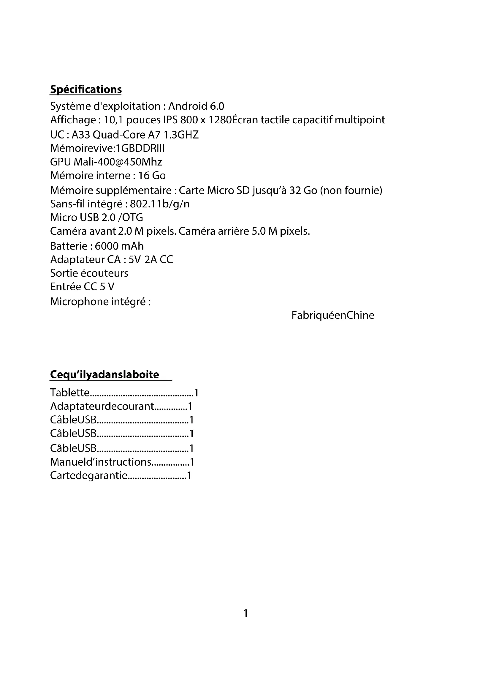 | Caractéristiques techniques | Écran 10.1 pouces, résolution 1280 x 800 pixels, processeur Quad-Core, 2 Go de RAM, 32 Go de stockage interne, extensible via microSD. |