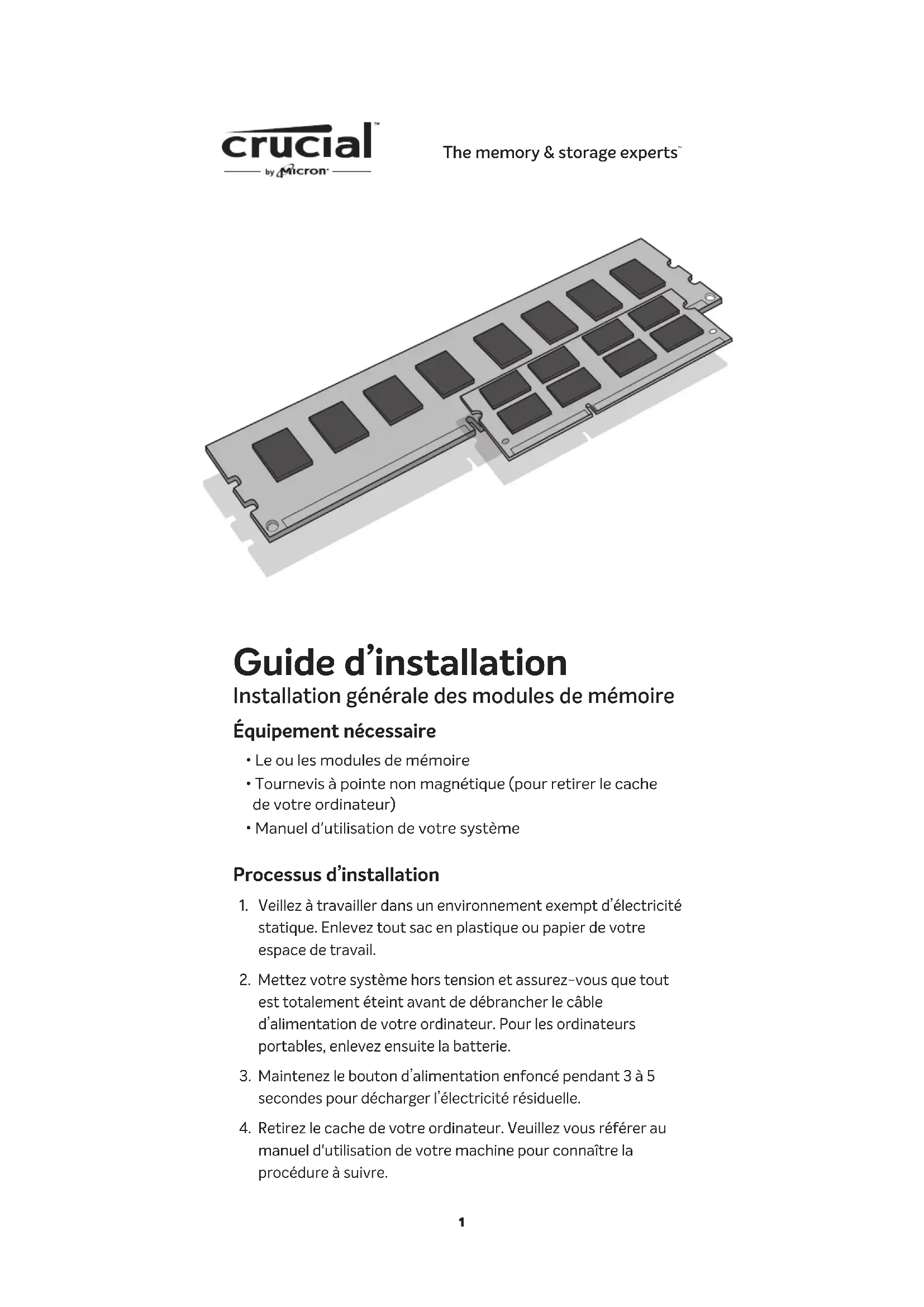 correspondance de la mémoire, suivez les invites pour accéder au menu Setup (Configuration), puis sélectionnez Save (Enregistrer) et Exit (Quitter). (Il ne s’agit pas d’une erreur : certains systèmes nécessitent cette procédure pour mettre à jour les paramètres système.) Si vous rencontrez des problèmes au cours de l’installation ou que vous avez des questions à propos de celle-ci, n’hésitez pas à contacter l’assistance de Crucial. 3Ressources utiles pour bénéficier d’une assistance avec la mémoire Amérique du Nord et Amérique du Sud : http://www.crucial.com/usa/en/support-memory Europe Royaume-Uni : http://uk.crucial.com/gbr/en/support-memory Union européenne : http://eu.crucial.com/eur/en/support-memory France : http://www.crucial.fr/fra/fr/aide-memoire Italie : http://it.crucial.com/ita/it/assistenza-memoria-ram Allemagne : http://www.crucial.de/deu/de/support-memory Asie-Pacifique Australie/Nouvelle-Zélande : http://www.crucial.com/usa/en/support-memory Chine : http:// www.crucial.cn/安装指南 Japon : http://www.crucial.jp/jpn/ja/support-memory