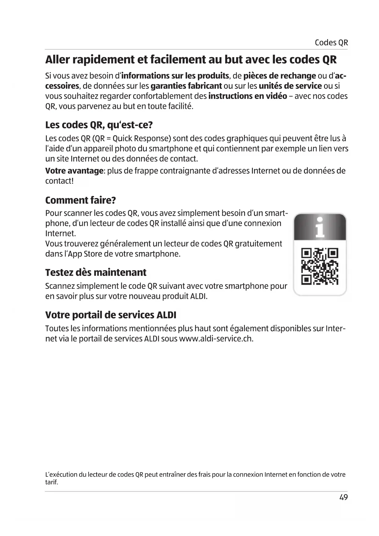 - Mentions légales Codes QR Aller rapidement et facilement au but avec les codes QR Si vous avez besoin d‘informations sur les produits, de pièces de rechange ou d‘ac- cessoires, de données sur les garanties fabricant ou sur les unités de service ou si vous souhaitez regarder confortablement des instructions en vidéo – avec nos codes QR, vous parvenez au but en toute facilité. Les codes QR, qu‘est-ce? Les codes QR (QR = Quick Response) sont des codes graphiques qui peuvent être lus à l‘aide d‘un appareil photo du smartphone et qui contiennent par exemple un lien vers un site Internet ou des données de contact. Votre avantage: plus de frappe contraignante d‘adresses Internet ou de données de contact! Comment faire? Pour scanner les codes QR, vous avez simplement besoin d‘un smart- phone, d‘un lecteur de codes QR installé ainsi que d‘une connexion Internet. Vous trouverez généralement un lecteur de codes QR gratuitement dans l‘App Store de votre smartphone. Testez dès maintenant Scannez simplement le code QR suivant avec votre smartphone pour en savoir plus sur votre nouveau produit ALDI. Votre portail de services ALDI Toutes les informations mentionnées plus haut sont également disponibles sur Inter- net via le portail de services ALDI sous www.aldi-service.ch. Codes QR L‘exécution du lecteur de codes QR peut entraîner des frais pour la connexion Internet en fonction de votre tarif. p. 9049
