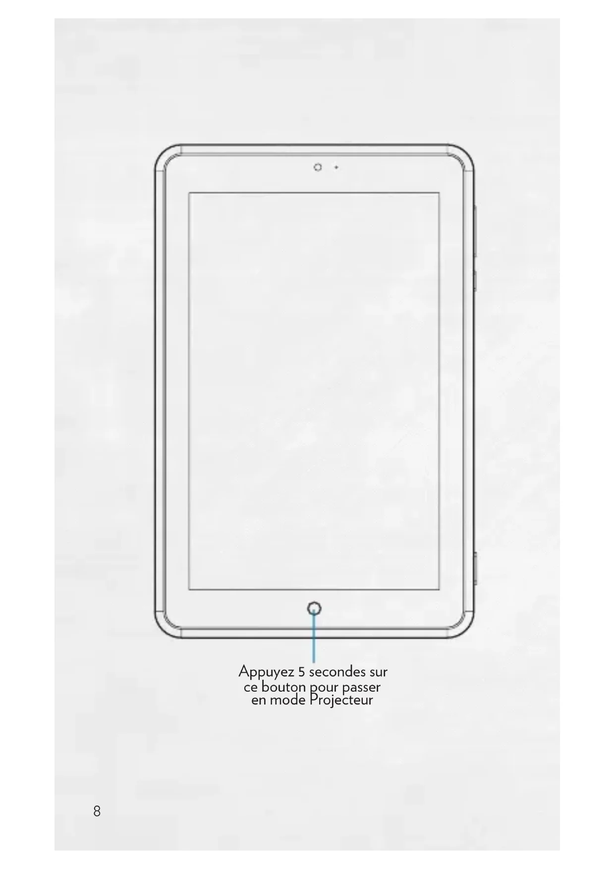 8’’ IPS tactile capacitif 1280 x 800 px, format 16:9 RK3188T Quadcore 1.4Ghz 2 Go DDR/32 Go Flash Wifi 802.11 b/g /n, Bluetooth 5 Mpx / 2 Mpx 8000 mAh Li-Ion Formats supportés par Android™/Tuner radio FM 1 Watt 360 degrés Micro USB avec fonction OTG / Port carte Micro SDHC / Sortie Audio prise jack 3.5 mm 215 x 138 x 13 mm 521 g DLP 0.3EM’’ DMD panel by Texas Instruments LED (R/G/B) 854 x 480 px ( 16/9 format) 8 mm Manuel 1.19:1 (distance/largeur) 51cm à 254 cm (diagonal) 50 Lumens 1000:1 > 20000H Écran Résolution Processeur RAM/Mémoire interne Réseau Caméra / Webcam Batterie Multimédia Haut-parleur G-sensor Connectiques Dimensions Poids Projecteur Source de projection Résolution Focal de l’Objectif Mise au point Ratio de projection Projection de l’image Luminosité Contraste LED durée de vie CARACTÉRISTIQUES PROJECTEUR7 BOUTONS ET ÉLÉMENTS DE L’APPAREIL Haut Parleur Haut Parleur