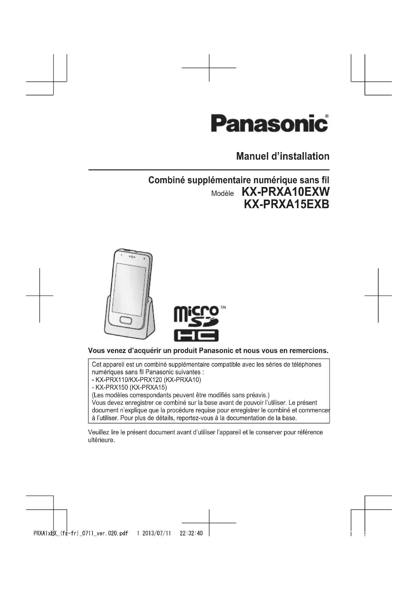 Installation PRXA1xEX_(de-de)_0711_ver.020.pdf 12 2013/07/11 22:09:06Manuel d’installation Combiné supplémentaire numérique sans fil Modèle KX-PRXA10EXW KX-PRXA15EXB Vous venez d’acquérir un produit Panasonic et nous vous en remercions. Cet appareil est un combiné supplémentaire compatible avec les séries de téléphones numériques sans fil Panasonic suivantes : - KX-PRX110/KX-PRX120 (KX-PRXA10) - KX-PRX150 (KX-PRXA15) (Les modèles correspondants peuvent être modifiés sans préavis.) Vous devez enregistrer ce combiné sur la base avant de pouvoir l’utiliser. Le présent document n’explique que la procédure requise pour enregistrer le combiné et commencer à l’utiliser. Pour plus de détails, reportez-vous à la documentation de la base. Veuillez lire le présent document avant d’utiliser l’appareil et le conserver pour référence ultérieure. PRXA1xEX_(fr-fr)_0711_ver.020.pdf 1 2013/07/11 22:32:40Accessoires fournis Accessoire/Référence Quantité Chargeur 1 Adaptateur secteur/PNLV226CEK