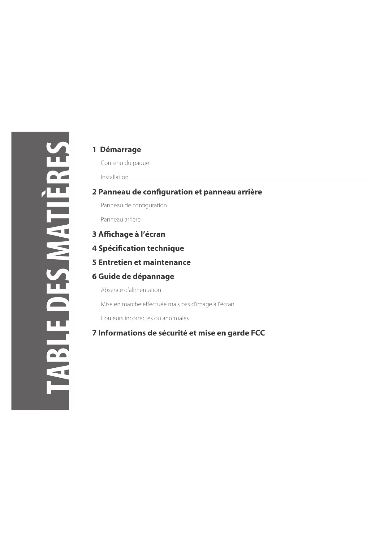 - Ne jamais essayer de réparer votre moniteur vous-même. Faites toujours appel à votre centre d’entretien ou à un technicien qualié pour le faire.GUIDE DE DÉPANNAGE