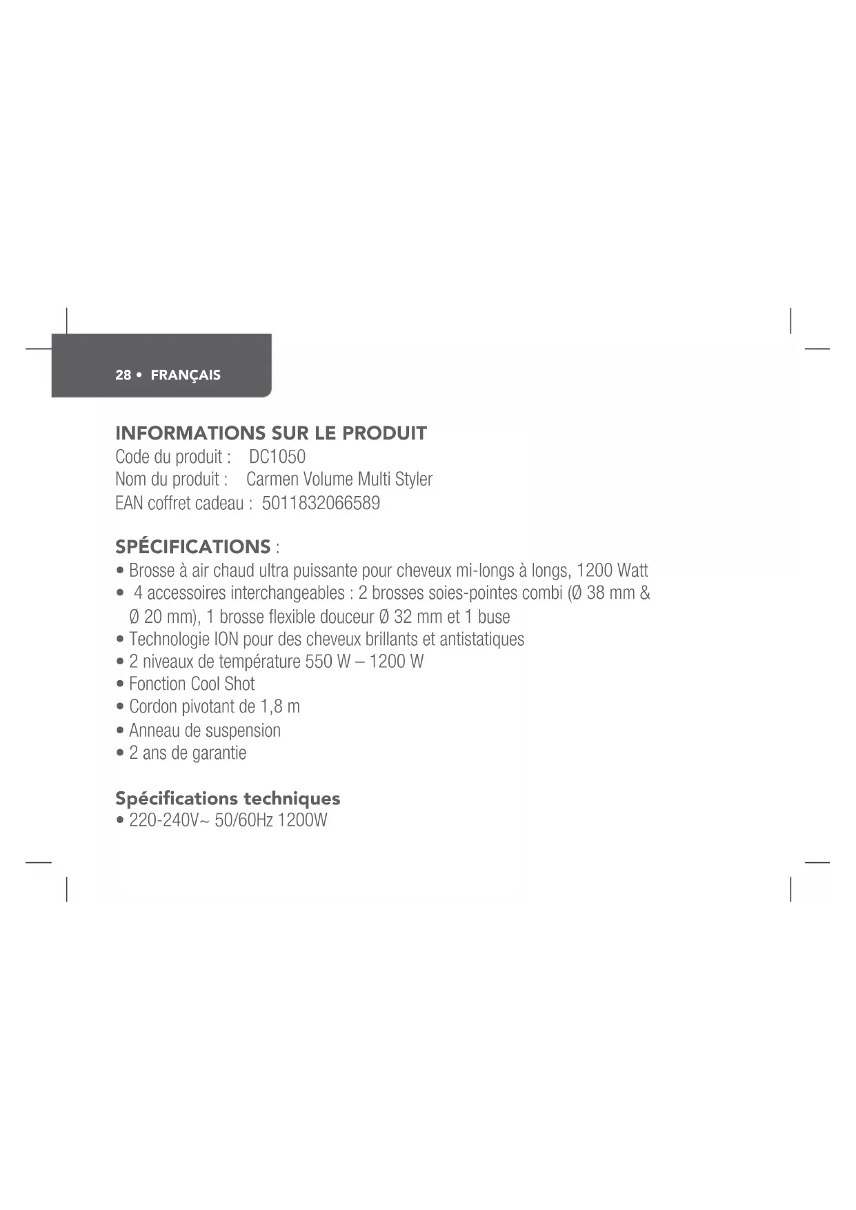 Volume Multi Styler DC1050 - Lisseur Carmen - Notice d'utilisation et mode d'emploi gratuit
