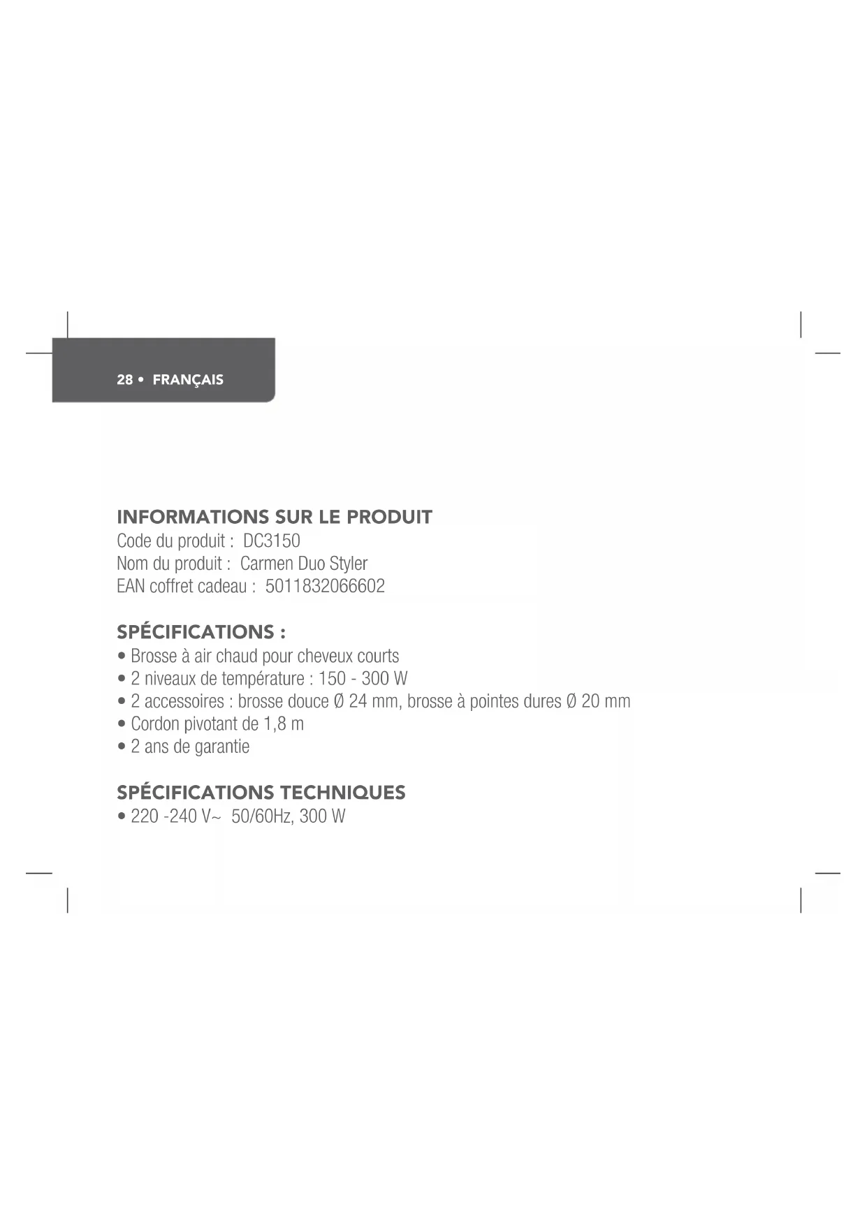 | Caractéristiques techniques | Lisseur Carmen Duo Styler DC3150 |