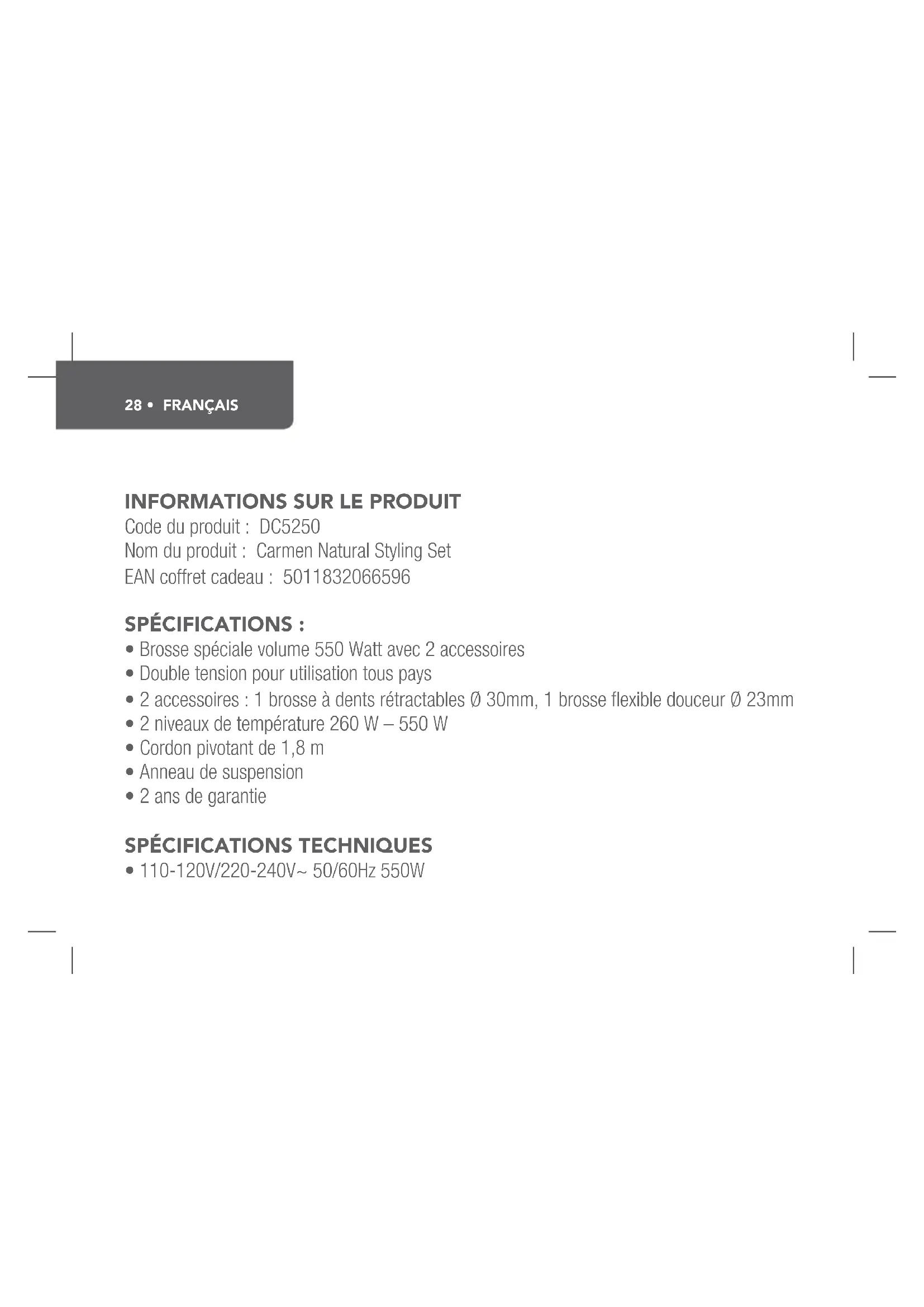 | Caractéristiques techniques | Lisseur Carmen Natural Styling Set DC5250 |