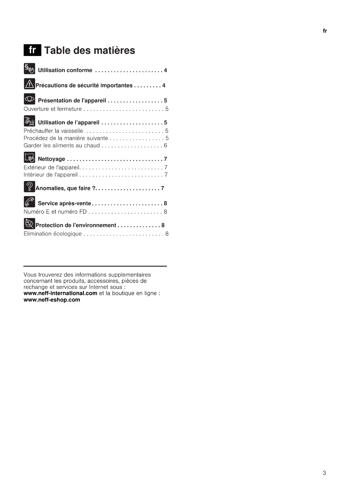 - Présentation de l'appareil . . . . . . . . . . . . . . . . . . 5 Ouverture et fermeture . . . . . . . . . . . . . . . . . . . . . . . . . 5 1 Utilisation de l’appareil . . . . . . . . . . . . . . . . . . . . 5 Préchauffer la vaisselle . . . . . . . . . . . . . . . . . . . . . . . . 5 Procédez de la manière suivante . . . . . . . . . . . . . . . . . 5 Garder les aliments au chaud . . . . . . . . . . . . . . . . . . . 6 D Nettoyage . . . . . . . . . . . . . . . . . . . . . . . . . . . . . . . 7 Extérieur de l'appareil. . . . . . . . . . . . . . . . . . . . . . . . . . 7 Intérieur de l'appareil . . . . . . . . . . . . . . . . . . . . . . . . . . 7 3 Anomalies, que faire ?. . . . . . . . . . . . . . . . . . . . . 7 4 Service après-vente . . . . . . . . . . . . . . . . . . . . . . . 8 Numéro E et numéro FD . . . . . . . . . . . . . . . . . . . . . . . 8 7 Protection de l'environnement . . . . . . . . . . . . . . 8 Elimination écologique . . . . . . . . . . . . . . . . . . . . . . . . . 8 Produktinfo Vous trouverez des informations supplementaires concernant les produits, accessoires, pièces de rechange et services sur Internet sous : www.neff-international.com et la boutique en ligne : www.neff-eshop.comfr Utilisation conforme