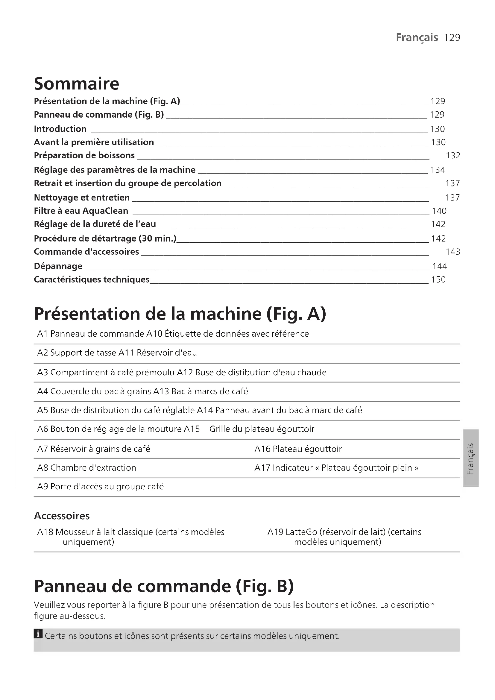 Français FrançaisFrançais Sommaire Présentation de la machine (Fig. A)________________________________________________________ 129Panneau de commande (Fig. B) ___________________________________________________________ 129Introduction ____________________________________________________________________________ 130Avant la première utilisation______________________________________________________________ 130 Préparation de boissons __________________________________________________________________ 132 Réglage des paramètres de la machine ____________________________________________________ 134 Retrait et insertion du groupe de percolation ______________________________________________ 137 Nettoyage et entretien ___________________________________________________________________ 137 Filtre à eau AquaClean ___________________________________________________________________ 140Réglage de la dureté de l’eau _____________________________________________________________ 142Procédure de détartrage (30min.)_________________________________________________________ 142 Commande d'accessoires _________________________________________________________________ 143 Dépannage ______________________________________________________________________________ 144Caractéristiques techniques_______________________________________________________________ 150 Présentation de la machine (Fig. A) A1 Panneau de commande A10 Étiquette de données avec référenceA2 Support de tasse A11 Réservoir d'eauA3 Compartiment à café prémoulu A12 Buse de distibution d'eau chaudeA4 Couvercle du bac à grains A13 Bac à marcs de caféA5 Buse de distribution du café réglable A14 Panneau avant du bac à marc de caféA6 Bouton de réglage de la mouture A15 Grille du plateau égouttoirA7 Réservoir à grains de café A16 Plateau égouttoirA8 Chambre d'extraction A17 Indicateur «Plateau égouttoir plein»A9 Porte d'accès au groupe café Accessoires A18 Mousseur à laitclassique (certains modèlesuniquement)A19 LatteGo (réservoir de lait) (certainsmodèles uniquement) Panneau de commande (Fig. B) Veuillez vous reporter à la figureB pour une présentation de tous les boutons et icônes. La descriptionfigure au-dessous. Certains boutons et icônes sont présents sur certains modèles uniquement.130 Français B1 Bouton marche/arrêt B7 Icônes d’alerte B2 Icônes de boissons * B8 Voyant de démarrage B3 Icône de l’intensité d’arôme/de mouture du café B9 Marche/arrêt (bouton) B4 Icône de la quantité de boisson B10 Icône Calc/Clean B5 Icône de la quantité de lait (certains modèles uniquement) B11 Icône AquaClean B6 Icône de la température du café (certains modèles uniquement)