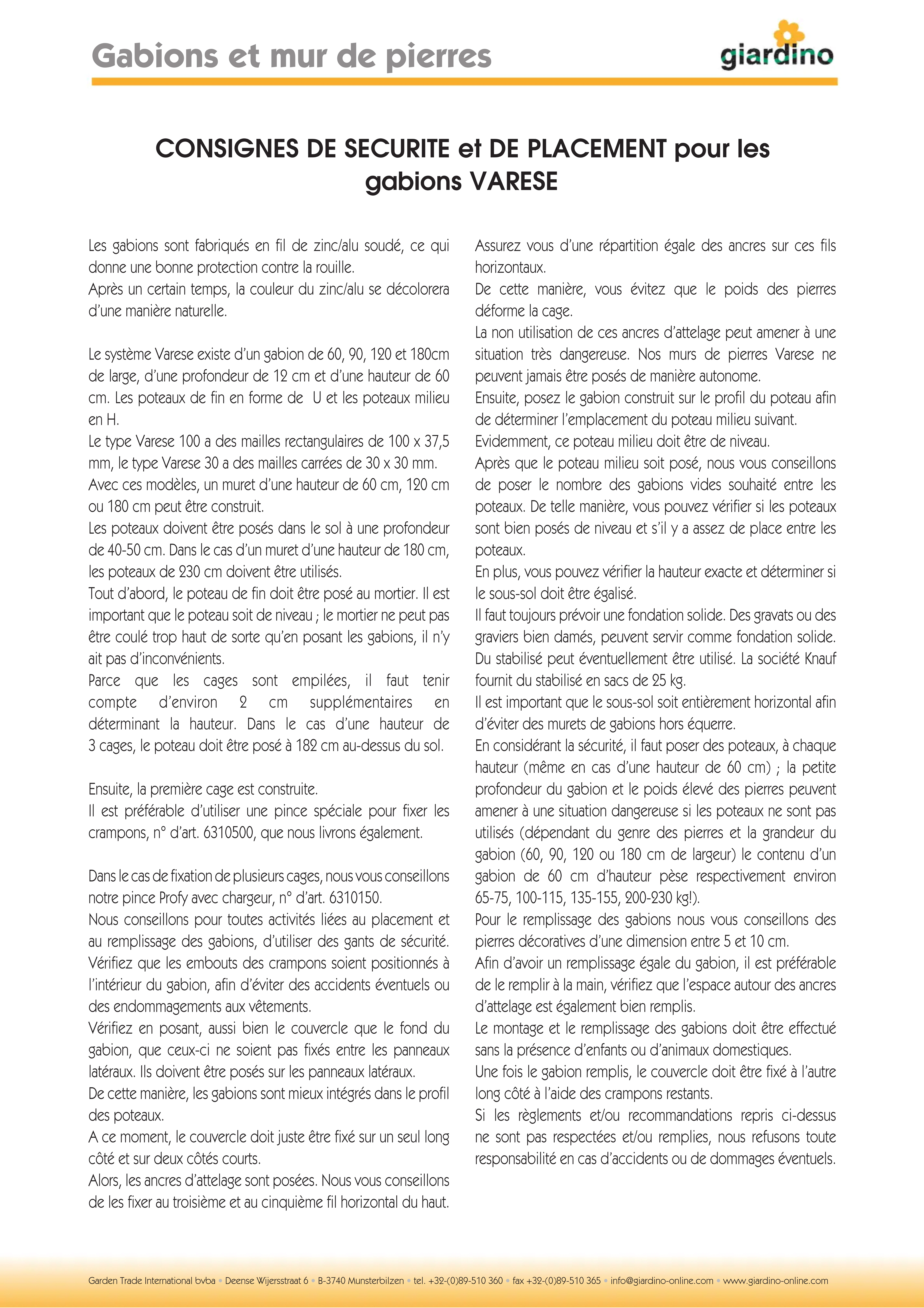 CONSIGNES DE SECURITE et DE PLACEMENT pour les gabions VARESE