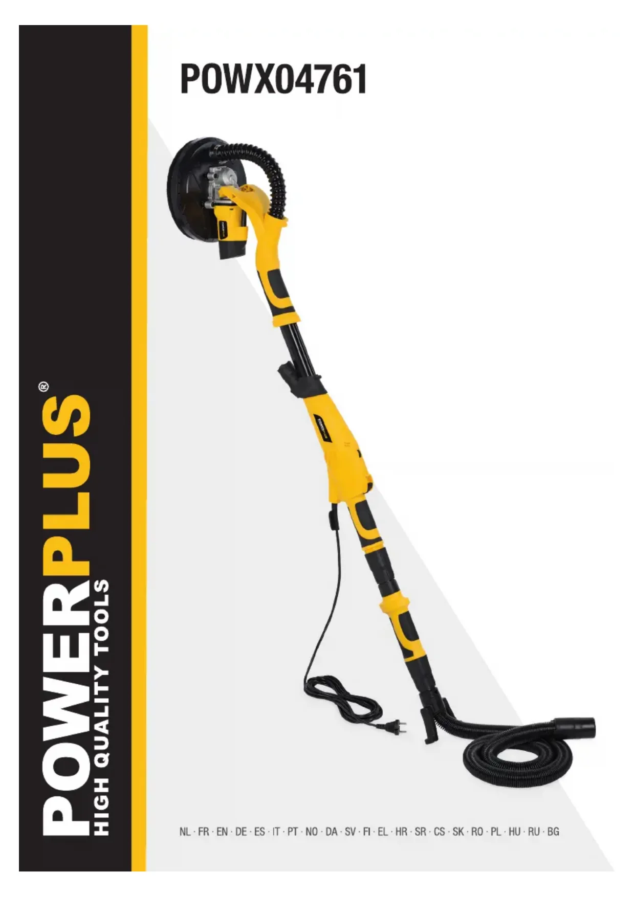 POWX04761 1 UTILISATION PREVUE La ponceuse de cloisons sèches est conçue pour poncer des murs et des plafonds constitués de cloisons sèches ou de plâtre. La ponceuse apporte une meilleure finition et permet un travail plus rapide que les méthodes de finition classiques, à la fois pour les nouvelles constructions et les travaux de rénovation. Elle est conçue pour travailler conjointement avec un aspirateur pour un minimum de poussière et de meilleurs résultats de ponçage. La tête de ponçage rotative permet d’obtenir d’excellents résultats dans un temps réduit et avec un minimum d’effort. Ne convient pas à une utilisation professionnelle. MISE EN GARDE ! Pour votre propre sécurité, lisez préalablement ce manuel et les consignes de sécurité générales avant d’utiliser la machine. Si vous cédez votre appareil, joignez-y toujours ce mode d'emploi. 2 DESCRIPTION (FIG. 1-2)