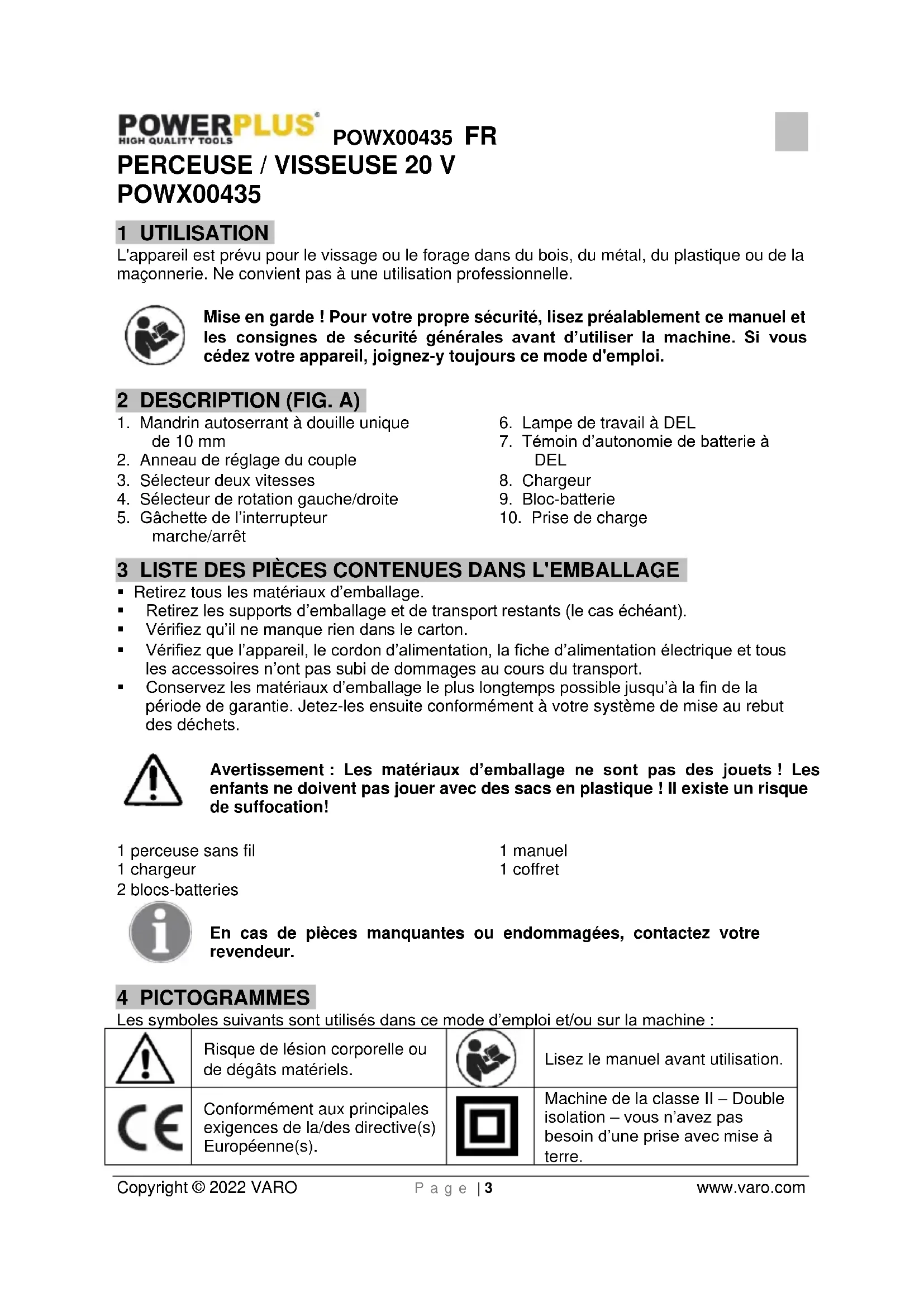 L'appareil est prévu pour le vissage ou le forage dans du bois, du métal, du plastique ou de la maçonnerie. Ne convient pas à une utilisation professionnelle.