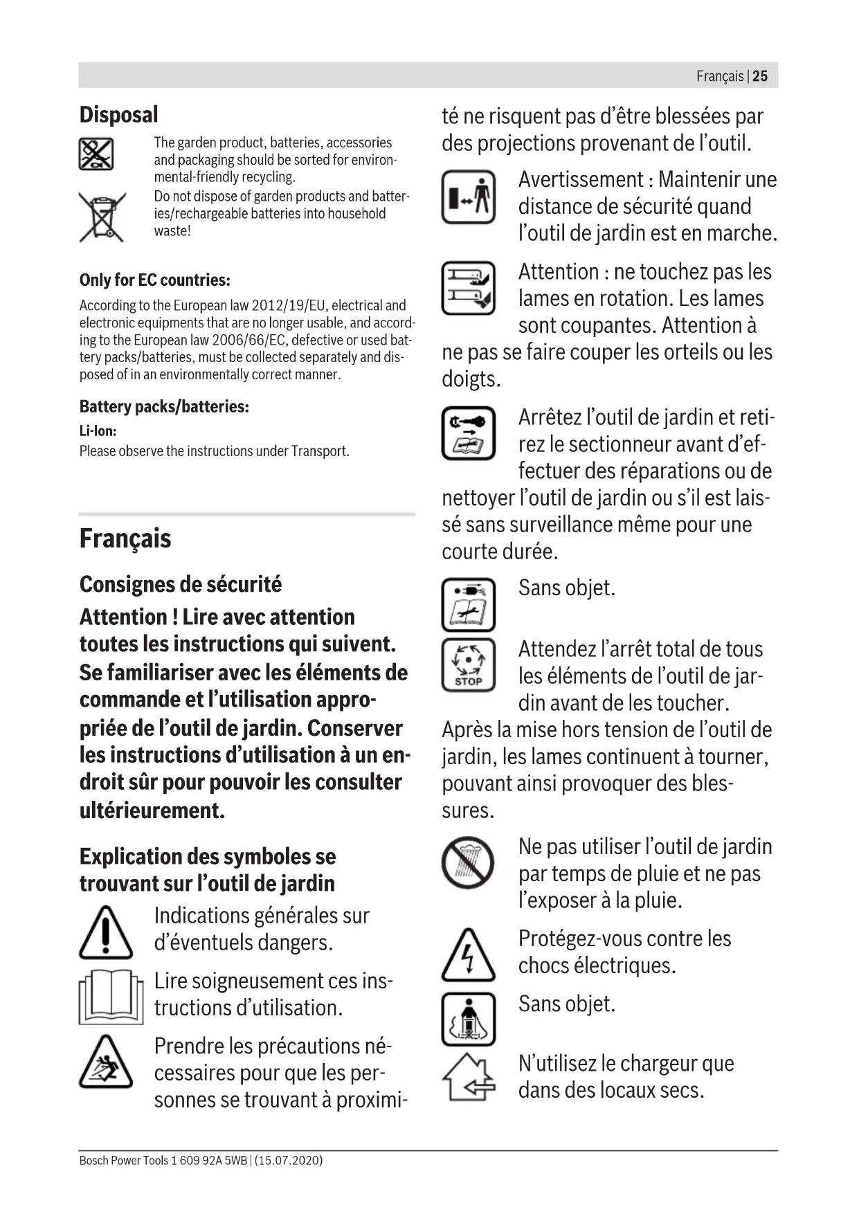 distance de sécurité quand l’outil de jardin est en marche. Attention: ne touchez pas les lames en rotation. Les lames sont coupantes. Attention à ne pas se faire couper les orteils ou les doigts. Arrêtez l’outil de jardin et reti- rez le sectionneur avant d’ef- fectuer des réparations ou de nettoyer l’outil de jardin ou s’il est lais- sé sans surveillance même pour une courte durée. Sans objet. Attendez l’arrêt total de tous les éléments de l’outil de jar- din avant de les toucher. Après la mise hors tension de l’outil de jardin, les lames continuent à tourner, pouvant ainsi provoquer des bles- sures. Ne pas utiliser l’outil de jardin par temps de pluie et ne pas l’exposer à la pluie. Protégez-vous contre les chocs électriques. Sans objet. N’utilisez le chargeur que dans des locaux secs. Bosch Power Tools 1 609 92A 5WB | (15.07.2020)26 | Français Le chargeur dispose d’un transformateur de sécurité. N’utilisez pas de nettoyeur haute pression ni de tuyau d’arrosage pour nettoyer l’outil de jar- din. Assurez-vous qu’il n’y ait pas d’animaux sauvages ou do- mestiques dans la zone dans laquelle l’outil de jardin doit être utili- sé. Les animaux sauvages ou domes- tiques peuvent être blessés pendant l’utilisation de la machine. Contrôlez soigneusement la zone d’utilisation de la machine et retirez pierres, bâtons, fils, os et corps étrangers. Lors de l’uti- lisation de la machine, assurez-vous qu’aucun animal sauvage ou domes- tique, ni des petits troncs d’arbre ne soient cachés dans l’herbe épaisse. Utilisation u Ne laissez jamais un enfant ou une autre personne n’ayant pas pris connaissance des instructions d’utili- sation se servir du produit. Il est pos- sible que les réglementations natio- nales limitent l’âge minimum de l’opérateur. Gardez le produit non utilisé hors de la portée des enfants. u Ne permettez jamais aux enfants ou personnes ne disposant pas des ca- pacités physiques, sensorielles ou mentales adaptées ou n’ayant pas l’expérience et/ou les connaissances nécessaires d’utiliser ce produit. Il est possible que les réglementations nationales limitent l’âge minimum de l’opérateur. u Les enfants doivent être surveillés pour s’assurer qu’ils ne jouent pas avec le produit. u N’utilisez jamais l’outil de jardin lorsque des personnes, en particu- lier des enfants ou des animaux do- mestiques, se trouvent à proximité. u L’utilisateur de la tondeuse est res- ponsable des accidents et des dom- mages causés à autrui ou à leurs biens. u Ne portez pas de chaussures en ca- outchouc ouverts ou des sandalettes quand vous utilisez le produit. Portez toujours des chaussures fermées et des pantalons longs. Ne faites jamais fonctionner le produit si vous êtes pieds nus. u Inspectez soigneusement la surface à travailler et éliminez pierres, bâ- tons, fils métalliques, os et autres corps étrangers. u Avant de mettre l’appareil en marche, contrôlez toujours si les lames, les vis des lames et le sous- groupe de coupage ne sont pas usés ou endommagés. Remplacez les lames usées ou endommagées tou- jours en même temps que les vis des lames pour éviter tout balourd. u Ne tondez que de jour ou sous un bon éclairage artificiel. u Ne travaillez pas avec la tondeuse à gazon dans des conditions météoro- logiques défavorables et plus parti- 1 609 92A 5WB | (15.07.2020) Bosch Power ToolsFrançais | 27 culièrement en cas d’approche d’orage. u Si possible, n’utilisez pas l’outil de jardin lorsque l’herbe est mouillée. u Ne menez l’appareil qu’au pas, ne ja- mais courir. u N’utilisez jamais l’outil de jardin quand les équipements de sécurité sont défectueux, sans carter ou sans équipements de protection tels que par exemple le pare-chocs et/ou le bac de ramassage. u Pour votre propre protection, nous vous recommandons de porter une protection acoustique. u N’utilisez pas le produit si vous êtes fatigué ou sous l’emprise de drogues, d’alcool ou de médica- ments. u Travailler sur des talus peut être dan- gereux: – Ne tondez pas des pentes très abruptes. – Sur des pentes ou de l’herbe mouillée, faites attention à ne pas perdre l’équilibre. – Tondez toujours perpendiculaire- ment à la pente, jamais de haut en bas ou de bas en haut. – Faites très attention lors d’un changement de direction sur une pente. u Faites très attention en reculant ou en tirant l’outil de jardin vers vous. u Lors des travaux de tonte, poussez l’outil de jardin toujours vers l’avant et ne le tirez jamais vers vous. u Les lames doivent être totalement à l’arrêt quand vous devez incliner l’ou- til de jardin pour le transporter, quand vous traversez des surfaces autres que le gazon ou quand vous transportez l’outil de jardin entre deux surfaces à tondre. u N’inclinez pas l’outil de jardin lors du démarrage ou lorsque vous mettez le moteur en marche. u Mettez l’outil de jardin en marche conformément aux instructions du mode d’emploi et veillez à maintenir les pieds largement à l’écart des par- ties en rotation. u Tenez les pieds et les mains éloignés des parties rotatives de l’outil de jar- din. u Gardez une distance suffisante par rapport à la zone d’éjection lorsque vous travaillez avec l’outil de jardin. u Ne soulevez ni transportez jamais l’outil de jardin pendant que le mo- teur est en marche. u Faites attention lors du stockage à ce que les 4 roues de l’outil de jardin soient au sol. u Ne soulevez l’outil de jardin que par la poignée. Maniez la poignée avec prudence. u N’effectuez aucune modification sur la poignée. Des modifications non autorisées peuvent s’avérer pré- judiciables à la sécurité de votre ap- pareil et entraînent une augmenta- tion du niveau sonore et des vibra- Bosch Power Tools 1 609 92A 5WB | (15.07.2020)28 | Français tions ainsi qu’une réduction de la puissance
