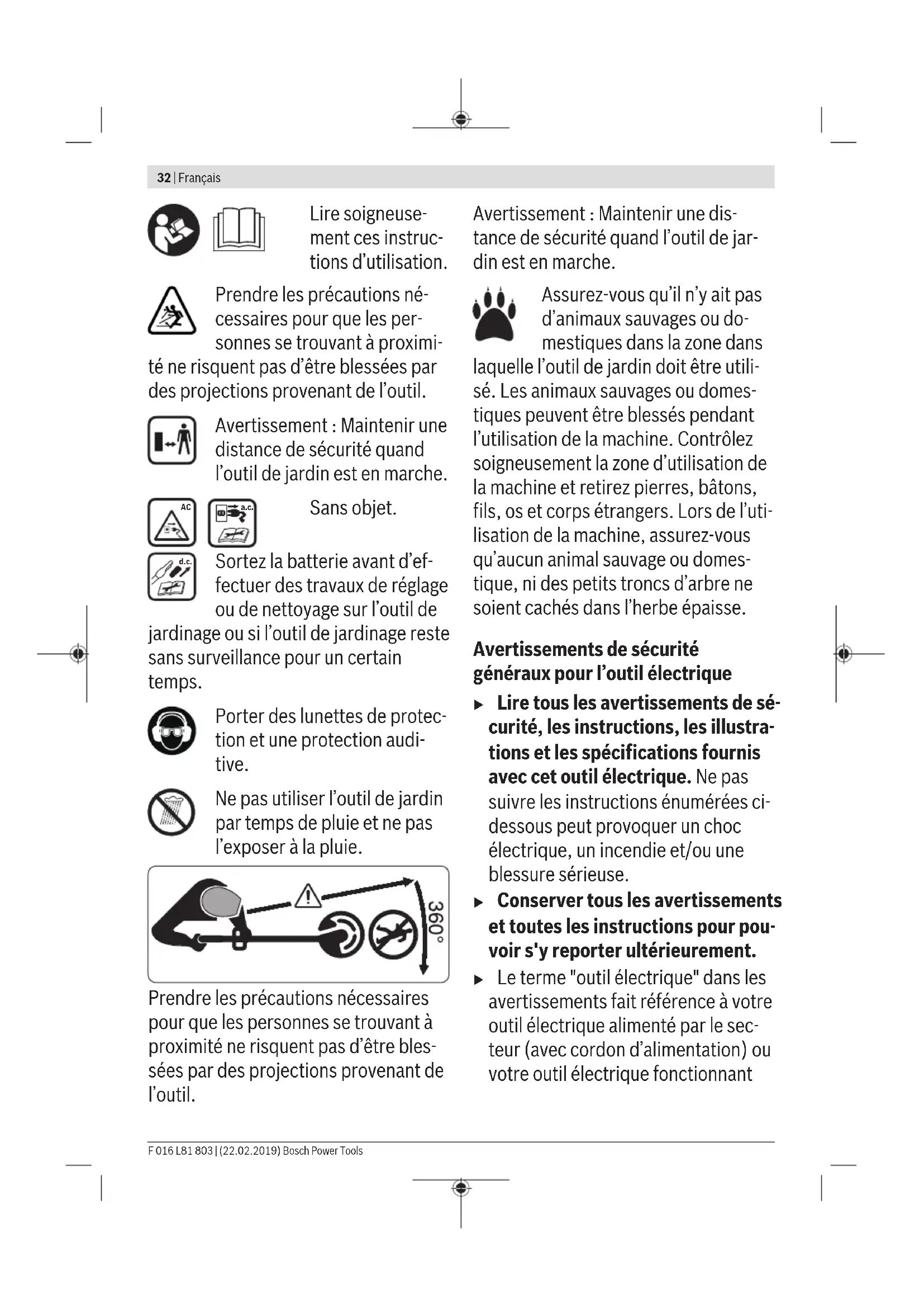 tance de sécurité quand l’outil de jar- din est en marche. Assurez-vous qu’il n’y ait pas d’animaux sauvages ou do- mestiques dans la zone dans laquelle l’outil de jardin doit être utili- sé. Les animaux sauvages ou domes- tiques peuvent être blessés pendant l’utilisation de la machine. Contrôlez soigneusement la zone d’utilisation de la machine et retirez pierres, bâtons, fils, os et corps étrangers. Lors de l’uti- lisation de la machine, assurez-vous qu’aucun animal sauvage ou domes- tique, ni des petits troncs d’arbre ne soient cachés dans l’herbe épaisse. Avertissements de sécurité généraux pour l’outil électrique u Lire tous les avertissements de sé- curité, les instructions, les illustra- tions et les spécifications fournis avec cet outil électrique. Ne pas suivre les instructions énumérées ci- dessous peut provoquer un choc électrique, un incendie et/ou une blessure sérieuse. u Conserver tous les avertissements et toutes les instructions pour pou- voir s'y reporter ultérieurement. u Le terme "outil électrique" dans les avertissements fait référence à votre outil électrique alimenté par le sec- teur (avec cordon d’alimentation) ou votre outil électrique fonctionnant F 016 L81 803 | (22.02.2019) Bosch Power ToolsFrançais | 33 sur batterie (sans cordon d’alimenta- tion). Sécurité de la zone de travail u Conserver la zone de travail propre et bien éclairée. Les zones en désordre ou sombres sont pro- pices aux accidents. u Ne pas faire fonctionner les outils électriques en atmosphère explo- sive, par exemple en présence de liquides inflammables, de gaz ou de poussières. Les outils élec- triques produisent des étincelles qui peuvent enflammer les poussières ou les fumées. u Maintenir les enfants et les per- sonnes présentes à l’écart pendant l’utilisation de l’outil électrique. Les distractions peuvent vous faire perdre le contrôle de l’outil. Sécurité électrique u Il faut que les fiches de l’outil élec- trique soient adaptées au socle. Ne jamais modifier la fiche de quelque façon que ce soit. Ne pas utiliser d’adaptateurs avec des ou- tils électriques à branchement de terre. Des fiches non modifiées et des socles adaptés réduisent le risque de choc électrique. u Éviter tout contact du corps avec des surfaces reliées à la terre telles que les tuyaux, les radia- teurs, les cuisinières et les réfrigé- rateurs. Il existe un risque accru de choc électrique si votre corps est re- lié à la terre. u Ne pas exposer les outils élec- triques à la pluie ou à des condi- tions humides. La pénétration d‘eau à l’intérieur d’un outil élec- trique augmente le risque de choc électrique. u Ne pas maltraiter le cordon. Ne ja- mais utiliser le cordon pour porter, tirer ou débrancher l’outil élec- trique. Maintenir le cordon à l’écart de la chaleur, du lubrifiant, des arêtes vives ou des parties en mouvement. Des cordons endom- magés ou emmêlés augmentent le risque de choc électrique. u Lorsqu’on utilise un outil élec- trique à l’extérieur, utiliser un pro- longateur adapté à l’utilisation ex- térieure. L’utilisation d’un cordon adapté à l’utilisation extérieure ré- duit le risque de choc électrique. u Si l'usage d'un outil électrique dans un emplacement humide est inévitable, utiliser une alimenta- tion protégée par un dispositif à courant différentiel résiduel (RCD). L'usage d'un RCD réduit le risque de choc électrique. Sécurité des personnes u Rester vigilant, regarder ce que vous êtes en train de faire et faire preuve de bon sens dans votre uti- lisation de l’outil électrique. Ne pas utiliser un outil électrique Bosch Power Tools F 016 L81 803 | (22.02.2019)34 | Français lorsque vous êtes fatigué ou sous l’emprise de drogues, de l’alcool ou de médicaments. Un moment d’inattention en cours d’utilisation d’un outil électrique peut entraîner des blessures graves. u Utiliser un équipement de protec- tion individuelle. Toujours porter une protection pour les yeux. Les équipements de protection indivi- duelle tels que les masques contre les poussières, les chaussures de sé- curité antidérapantes, les casques ou les protections auditives utilisés pour les conditions appropriées ré- duisent les blessures. u Éviter tout démarrage intempes- tif. S’assurer que l’interrupteur est en position arrêt avant de bran- cher l’outil au secteur et/ou au bloc de batteries, de le ramasser ou de le porter. Porter les outils électriques en ayant le doigt sur l’in- terrupteur ou brancher des outils électriques dont l’interrupteur est en position marche est source d’acci- dents. u Retirer toute clé de réglage avant de mettre l’outil électrique en marche. Une clé laissée fixée sur une partie tournante de l’outil élec- trique peut donner lieu à des bles- sures. u Ne pas se précipiter. Garder une position et un équilibre adaptés à tout moment. Cela permet un meilleur contrôle de l’outil électrique dans des situations inattendues. u S’habiller de manière adaptée. Ne pas porter de vêtements amples ou de bijoux. Garder les cheveux et les vêtements à distance des parties en mouvement. Des vête- ments amples, des bijoux ou les che- veux longs peuvent être pris dans des parties en mouvement. u Si des dispositifs sont fournis pour le raccordement d’équipements pour l’extraction et la récupéra- tion des poussières, s’assurer qu’ils sont connectés et correcte- ment utilisés. Utiliser des collec- teurs de poussière peut réduire les risques dus aux poussières. u Rester vigilant et ne pas négliger les principes de sécurité de l'outil sous prétexte que vous avez l'habi- tude de l'utiliser. Une fraction de seconde d'inattention peut provo- quer une blessure grave. Utilisation et entretien de l’outil électrique u Ne pas forcer l’outil électrique. Utiliser l’outil électriqu