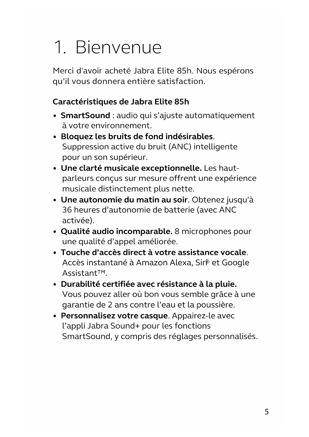 Merci d'avoir acheté Jabra Elite 85h. Nous espérons qu’il vous donnera entière satisfaction. Caractéristiques de Jabra Elite 85h
