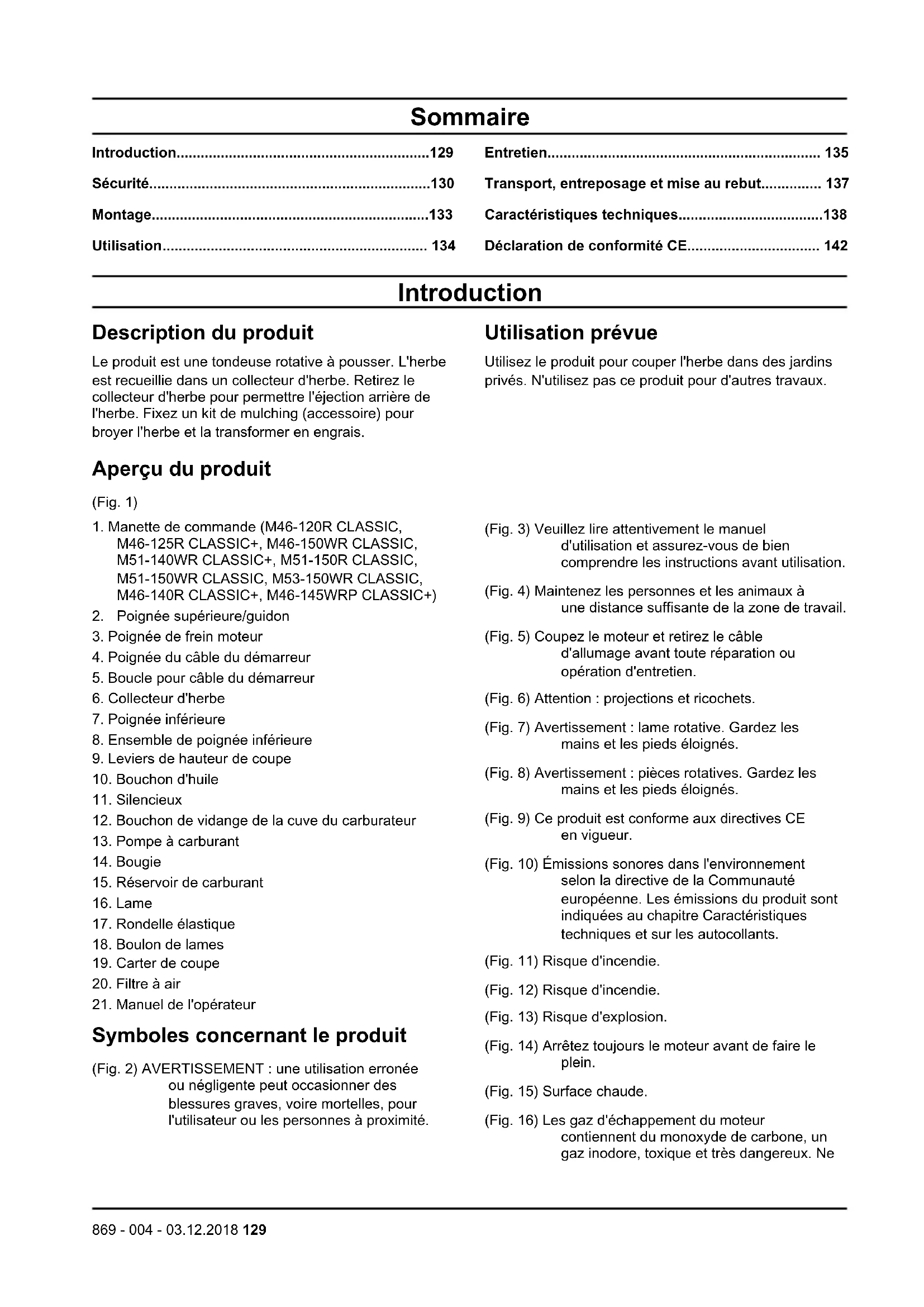 Conformément à la directive 2000/14/CE, Annexe V, les valeurs déclarées saines sont stipulées dans la section Données techniques de ce manuel et dans la Déclaration de Conformité signée de la CE. La tondeuse à pousser alimentée par moteur à combustion fournie correspond à l'exemplaire soumis à l'examen. 142 869 - 004 - 03.12.2018Sadržaj Uvod...........................................................................143 Sigurnost...................................................................144 Sastavljanje