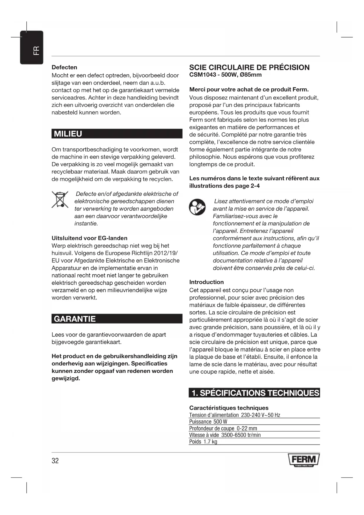 Vous disposez maintainant d'un excellent produit, proposé par l'un des principaux fabricants européens. Tous les produits que vous fournit Ferm sont fabriqués selon les normes les plus exigeantes en matière de performances et de sécurité. Complété par notre garantie très complète, l'excellence de notre service clientèle forme également partie intégrante de notre philosophie. Nous espérons que vous profiterez longtemps de ce produit.