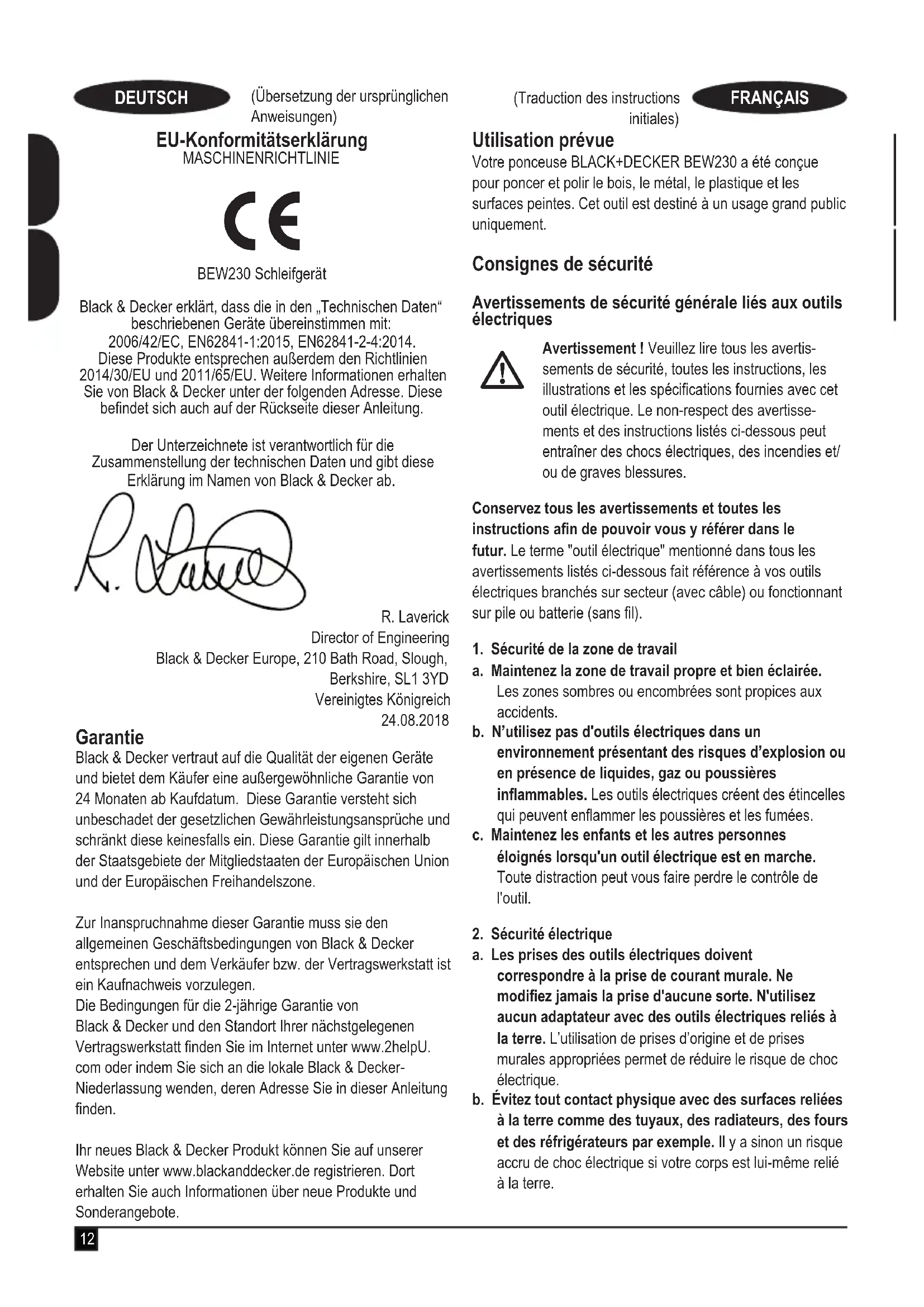 (Übersetzung der ursprünglichen Anweisungen) DEUTSCH (Traduction des instructions initiales) FRANÇAIS Utilisation prévue Votre ponceuse BLACK+DECKER BEW230 a été conçue pour poncer et polir le bois, le métal, le plastique et les surfaces peintes. Cet outil est destiné à un usage grand public uniquement. Consignes de sécurité Avertissements de sécurité générale liés aux outils électriques