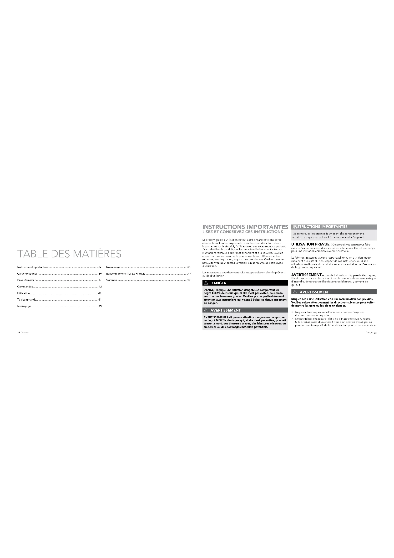 AVERTISSEMENT Risques liés à une installation inadéquate. Veuillez suivre attentivement les directives suivantes pour éviter de mettre les gens ou les biens en danger. S’assurer d’utiliser une prise électrique murale accessible pour qu’il soit possible de débrancher facilement l’appareil en cas d’urgence. Afin de réduire les risques d’incendie ou de décharge électrique, ne pas utiliser ce produit avec un dispositif externe de régulation de la vitesse à semi-conducteurs. Afin de réduire le risque d’incendie, de décharge électrique et de blessures, ne pas utiliser le produit dans une fenêtre. AVERTISSEMENT Dangers pour les enfants et autres personnes à risque. Cet appareil peut être utilisé par des enfants âgés d’au moins 8 ans et des personnes dont les capacités physiques, sensorielles ou mentales sont réduites, ou qui manquent d’expérience et de connaissances, pourvu que quelqu’un les surveille ou leur explique la façon sûre d’utiliser l’appareil afin qu’ils comprennent les risques potentiels. Les enfants ne doivent pas s’amuser avec cet appareil. Les enfants ne doivent pas effectuer le nettoyage ni l’entretien de l’appareil, sauf sous supervision. Ce produit et son matériel d’emballage ne sont pas des jouets et doivent être gardés hors de la portée des enfants. Renseignements au sujet de la déclaration de conformité de la CE Ce produit est conforme à toutes les directives pertinentes et nécessaires de la CE, y compris : - la directive « Basse tension » (DBT); - la directive sur la compatibilité électromagnétique (CEM); - la directive sur les produits liés à l’énergie (ErP); - la directive sur la limitation de l’utilisation de certaines substances dangereuses (RoHS); - la directive sur l’enregistrement, l’évaluation, l’autorisation et la restriction des produits chimiques (REACH). La déclaration de conformité complète est enregistrée et peut être fournie par l’importateur. RECYCLAGE DE L’EMBALLAGE : L’emballage protège l’appareil contre les dommages durant le transport. Les matériels d’emballage ont été sélectionnés en fonction de leurs propriétés écologiques et des technologies d’élimination. Ils peuvent donc être recyclés. Mettez tous les matériels d’emballage au rebut de façon à respecter l’environnement. Recyclage des DEEE Mise au rebut des déchets d’équipements électriques et électroniques : cette indication signale que, dans l’UE, ce produit39 Français 38 Français ne doit pas être mis au rebut avec les déchets domestiques. Par mesure de prévention pour l’environnement et la santé humaine, il est essentiel de le recycler de façon responsable selon le principe de réutilisation des ressources matérielles. Pour retourner votre appareil usagé, veuillez utiliser les systèmes de collecte et de reprise ou contacter le détaillant qui vous a vendu le produit. Celui-ci peut reprendre le produit afin de le faire recycler d’une façon qui respecte l’environnement Recyclage Des Piles ÉLIMINATION DES PILES - Les piles doivent être éliminées séparément du produit et ne doivent pas être jetées avec les déchets domestiques. Pour éliminer tous les types de piles, apportez-les à un centre d’élimination approuvé ou aux installations de gestion des déchets de votre région. Respectez les règlements actuellement en vigueur. En cas de doute, contactez votre centre d’élimination des déchets. En vertu de la loi, chaque consommateur a l’obligation de rapporter toutes les piles et tous les accumulateurs, qu’ils contiennent une substance dangereuse* ou non, à un point de collecte établi par la ville ou l’industrie, afin que ces piles et ces accumulateurs puissent être éliminés grâce à une méthode d’élimination écologique.