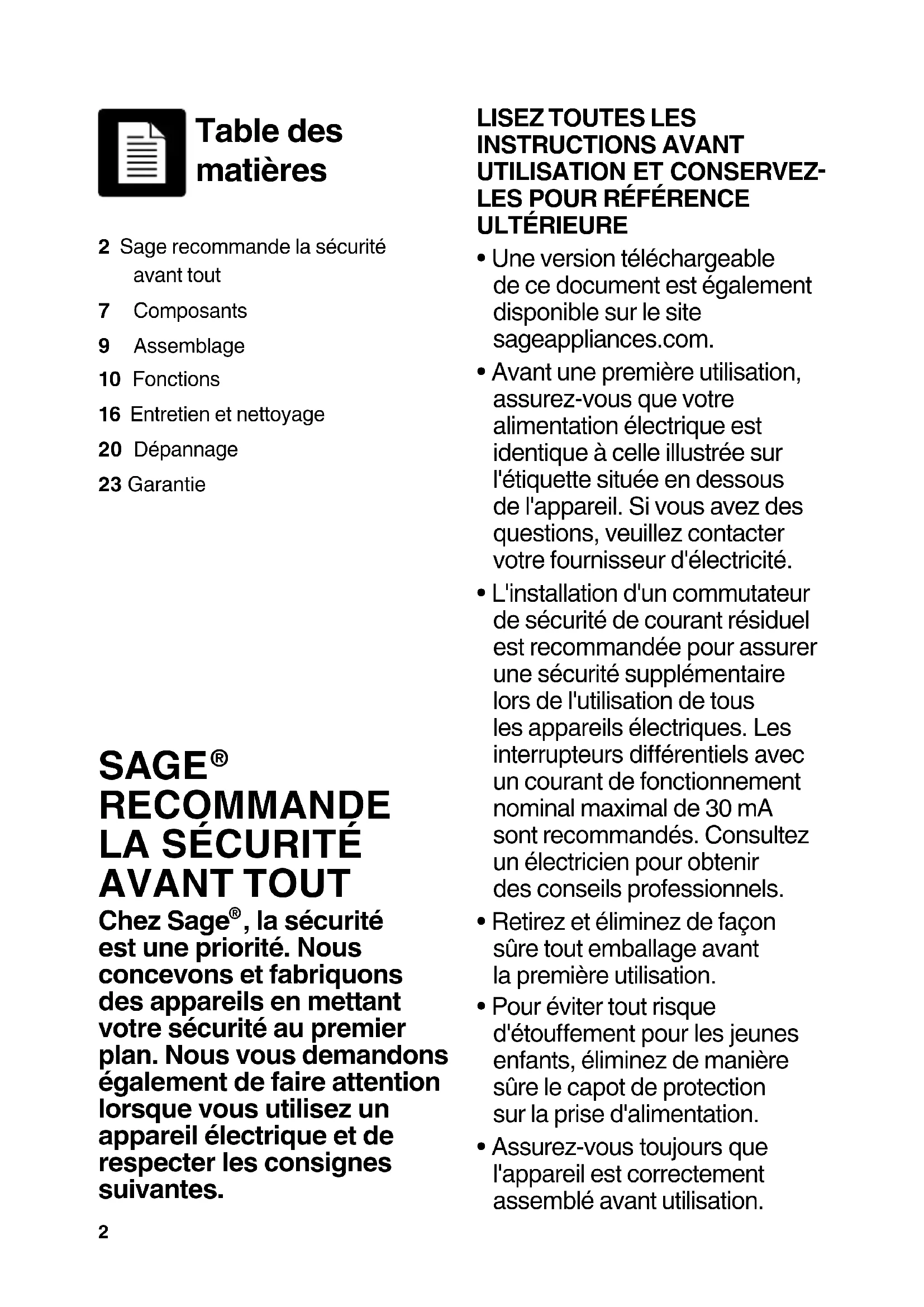 , la sécurité est une priorité. Nous concevons et fabriquons des appareils en mettant votre sécurité au premier plan. Nous vous demandons également de faire attention lorsque vous utilisez un appareil électrique et de respecter les consignes suivantes. Table des matières 2 Sage recommande la sécurité avant tout7 Composants9 Assemblage10 Fonctions16 Entretien et nettoyage20 Dépannage23 Garantie3