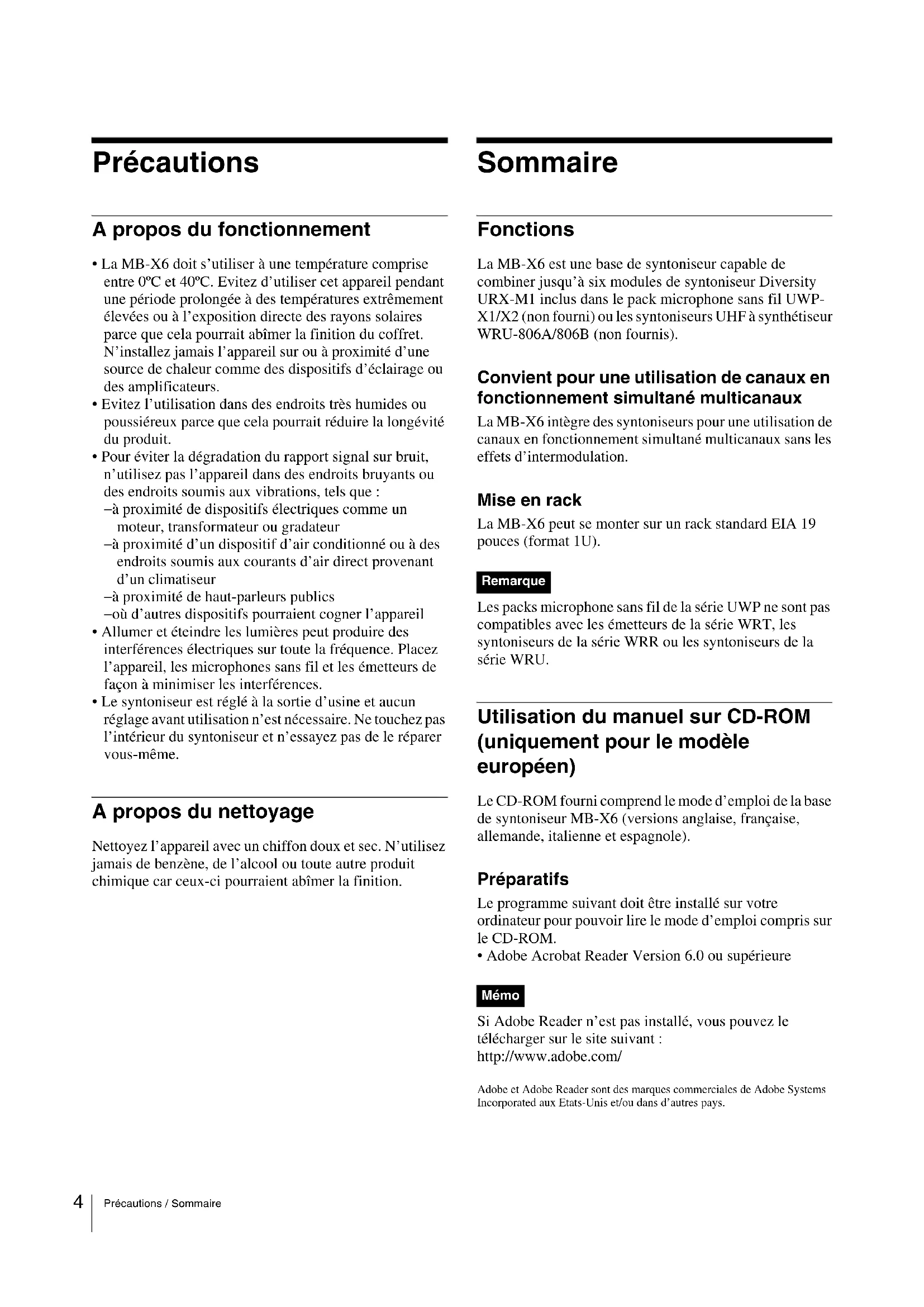 - Le syntoniseur est réglé à la sortie d’usine et aucun réglage avant utilisation n’est nécessaire. Ne touchez pas l’intérieur du syntoniseur et n’essayez pas de le réparer vous-même. A propos du nettoyage Nettoyez l’appareil avec un chiffon doux et sec. N’utilisez jamais de benzène, de l’alcool ou toute autre produit chimique car ceux-ci pourraient abîmer la finition. Sommaire Fonctions La MB-X6 est une base de syntoniseur capable de combiner jusqu’à six modules de syntoniseur Diversity URX-M1 inclus dans le pack microphone sans fil UWP- X1/X2 (non fourni) ou les syntoniseurs UHF à synthétiseur WRU-806A/806B (non fournis). Convient pour une utilisation de canaux en fonctionnement simultané multicanaux La MB-X6 intègre des syntoniseurs pour une utilisation de canaux en fonctionnement simultané multicanaux sans les effets d’intermodulation. Mise en rack La MB-X6 peut se monter sur un rack standard EIA 19 pouces (format 1U). Les packs microphone sans fil de la série UWP ne sont pas compatibles avec les émetteurs de la série WRT, les syntoniseurs de la série WRR ou les syntoniseurs de la série WRU. Utilisation du manuel sur CD-ROM (uniquement pour le modèle européen) Le CD-ROM fourni comprend le mode d’emploi de la base de syntoniseur MB-X6 (versions anglaise, française, allemande, italienne et espagnole). Préparatifs Le programme suivant doit être installé sur votre ordinateur pour pouvoir lire le mode d’emploi compris sur le CD-ROM.