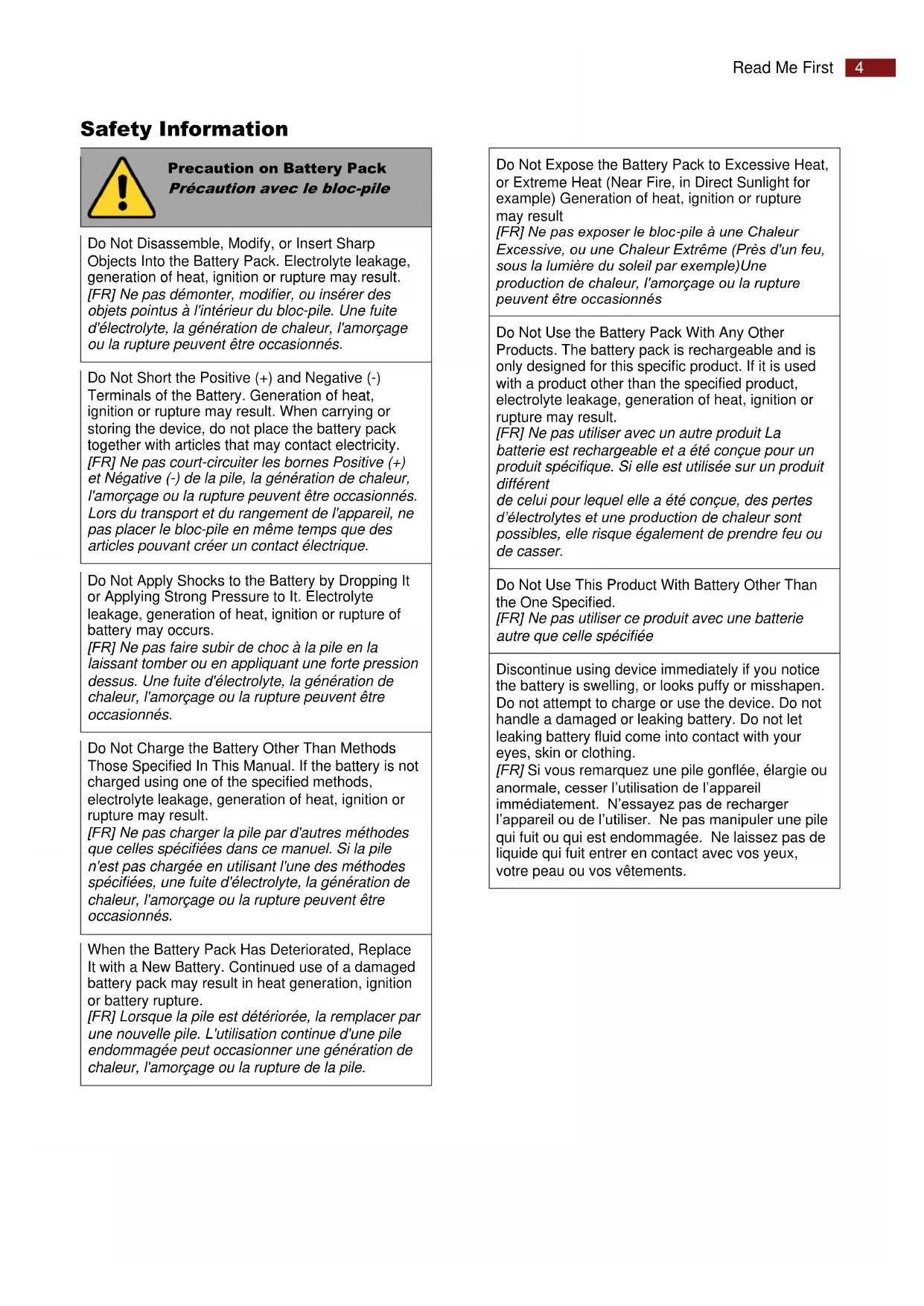 Precaution on Battery Pack Précaution avec le bloc-pile Do Not Disassemble, Modify, or Insert Sharp Objects Into the Battery Pack. Electrolyte leakage, generation of heat, ignition or rupture may result. [FR] Ne pas démonter, modifier, ou insérer des objets pointus à l'intérieur du bloc-pile. Une fuite d'électrolyte, la génération de chaleur, l'amorçage ou la rupture peuvent être occasionnés. Do Not Short the Positive (+) and Negative (-) Terminals of the Battery. Generation of heat, ignition or rupture may result. When carrying or storing the device, do not place the battery pack together with articles that may contact electricity. [FR] Ne pas court-circuiter les bornes Positive (+) et Négative (-) de la pile, la génération de chaleur, l'amorçage ou la rupture peuvent être occasionnés. Lors du transport et du rangement de l'appareil, ne pas placer le bloc-pile en même temps que des articles pouvant créer un contact électrique. Do Not Apply Shocks to the Battery by Dropping It or Applying Strong Pressure to It. Electrolyte leakage, generation of heat, ignition or rupture of battery may occurs. [FR] Ne pas faire subir de choc à la pile en la laissant tomber ou en appliquant une forte pression dessus. Une fuite d'électrolyte, la génération de chaleur, l'amorçage ou la rupture peuvent être occasionnés. Do Not Charge the Battery Other Than Methods Those Specified In This Manual. If the battery is not charged using one of the specified methods, electrolyte leakage, generation of heat, ignition or rupture may result. [FR] Ne pas charger la pile par d'autres méthodes que celles spécifiées dans ce manuel. Si la pile n'est pas chargée en utilisant l'une des méthodes spécifiées, une fuite d'électrolyte, la génération de chaleur, l'amorçage ou la rupture peuvent être occasionnés. When the Battery Pack Has Deteriorated, Replace It with a New Battery. Continued use of a damaged battery pack may result in heat generation, ignition or battery rupture. [FR] Lorsque la pile est détériorée, la remplacer par une nouvelle pile. L'utilisation continue d'une pile endommagée peut occasionner une génération de chaleur, l'amorçage ou la rupture de la pile. Do Not Expose the Battery Pack to Excessive Heat, or Extreme Heat (Near Fire, in Direct Sunlight for example) Generation of heat, ignition or rupture may result [FR] Ne pas exposer le bloc-pile à une Chaleur Excessive, ou une Chaleur Extrême (Près d'un feu, sous la lumière du soleil par exemple)Une production de chaleur, l'amorçage ou la rupture peuvent être occasionnés Do Not Use the Battery Pack With Any Other Products. The battery pack is rechargeable and is only designed for this specific product. If it is used with a product other than the specified product, electrolyte leakage, generation of heat, ignition or rupture may result. [FR] Ne pas utiliser avec un autre produit La batterie est rechargeable et a été conçue pour un produit spécifique. Si elle est utilisée sur un produit différent de celui pour lequel elle a été conçue, des pertes d’électrolytes et une production de chaleur sont possibles, elle risque également de prendre feu ou de casser. Do Not Use This Product With Battery Other Than the One Specified. [FR] Ne pas utiliser ce produit avec une batterie autre que celle spécifiée Discontinue using device immediately if you notice the battery is swelling, or looks puffy or misshapen. Do not attempt to charge or use the device. Do not handle a damaged or leaking battery. Do not let leaking battery fluid come into contact with your eyes, skin or clothing. [FR] Si vous remarquez une pile gonflée, élargie ou anormale, cesser l’utilisation de l’appareil immédiatement. N’essayez pas de recharger l’appareil ou de l’utiliser. Ne pas manipuler une pile qui fuit ou qui est endommagée. Ne laissez pas de liquide qui fuit entrer en contact avec vos yeux, votre peau ou vos vêtements.5 Read Me First