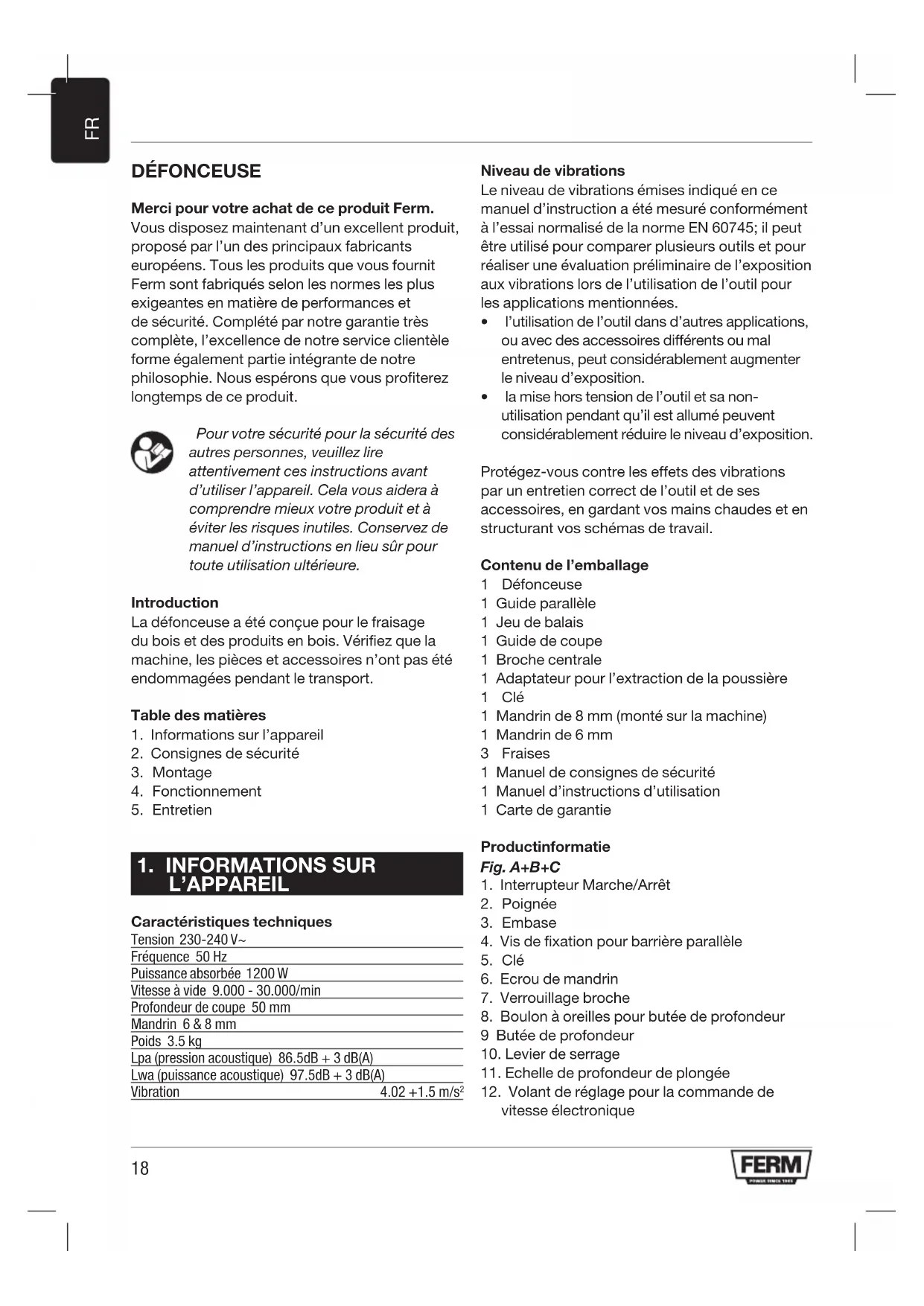 DÉFONCEUSE Merci pour votre achat de ce produit Ferm. Vous disposez maintenant d’un excellent produit, proposé par l’un des principaux fabricants européens. Tous les produits que vous fournit Ferm sont fabriqués selon les normes les plus exigeantes en matière de performances et de sécurité. Complété par notre garantie très complète, l’excellence de notre service clientèle forme également partie intégrante de notre philosophie. Nous espérons que vous profiterez longtemps de ce produit. Pour votre sécurité pour la sécurité des autres personnes, veuillez lire attentivement ces instructions avant d’utiliser l’appareil. Cela vous aidera à comprendre mieux votre produit et à éviter les risques inutiles. Conservez de manuel d’instructions en lieu sûr pour toute utilisation ultérieure. Introduction La défonceuse a été conçue pour le fraisage du bois et des produits en bois. Vérifiez que la machine, les pièces et accessoires n’ont pas été endommagées pendant le transport. Table des matières