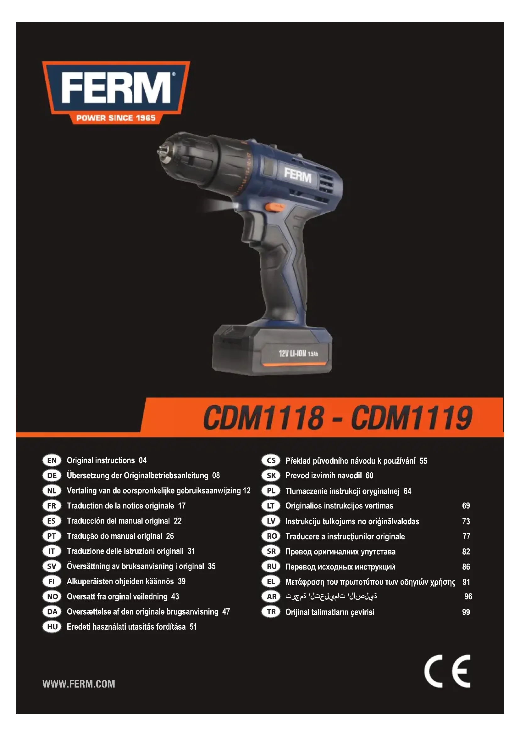 Perceuse-visseuse sans fil Li-ion 12V CDM1118/CDM1119 Merci d’avoir choisi ce produit Ferm. Vous avez faitlechoixd’unproduitdequalité,fournipar l’undesprincipauxfournisseurseuropéens.Tous lesproduitsvendusparFermsontfabriqués conformémentauxnormeslesplusstrictesen matièredeperformancesetdesécurité.