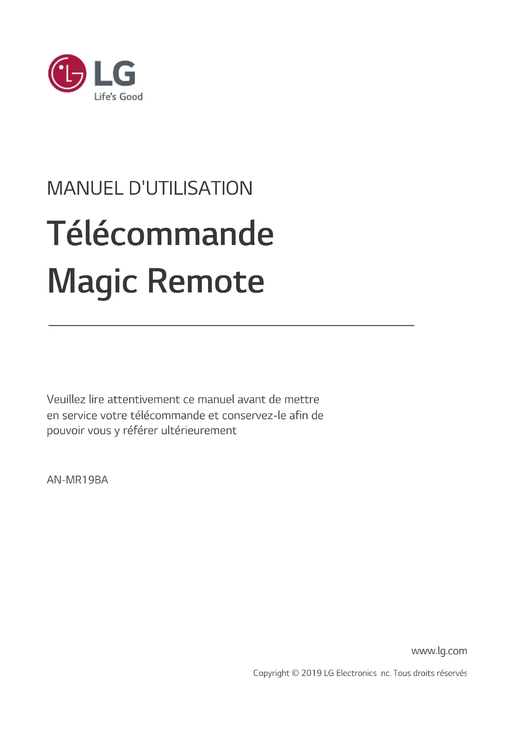 www.lg.com Copyright © 2019 LG Electronics inc. Tous droits réservés.2 ACCESSOIRES L’image affichée de la télécommande peut différer du produit réel. ( Selon le pays) TélécommandeMagic et piles alcalines (AA) Manuel d’utilisation