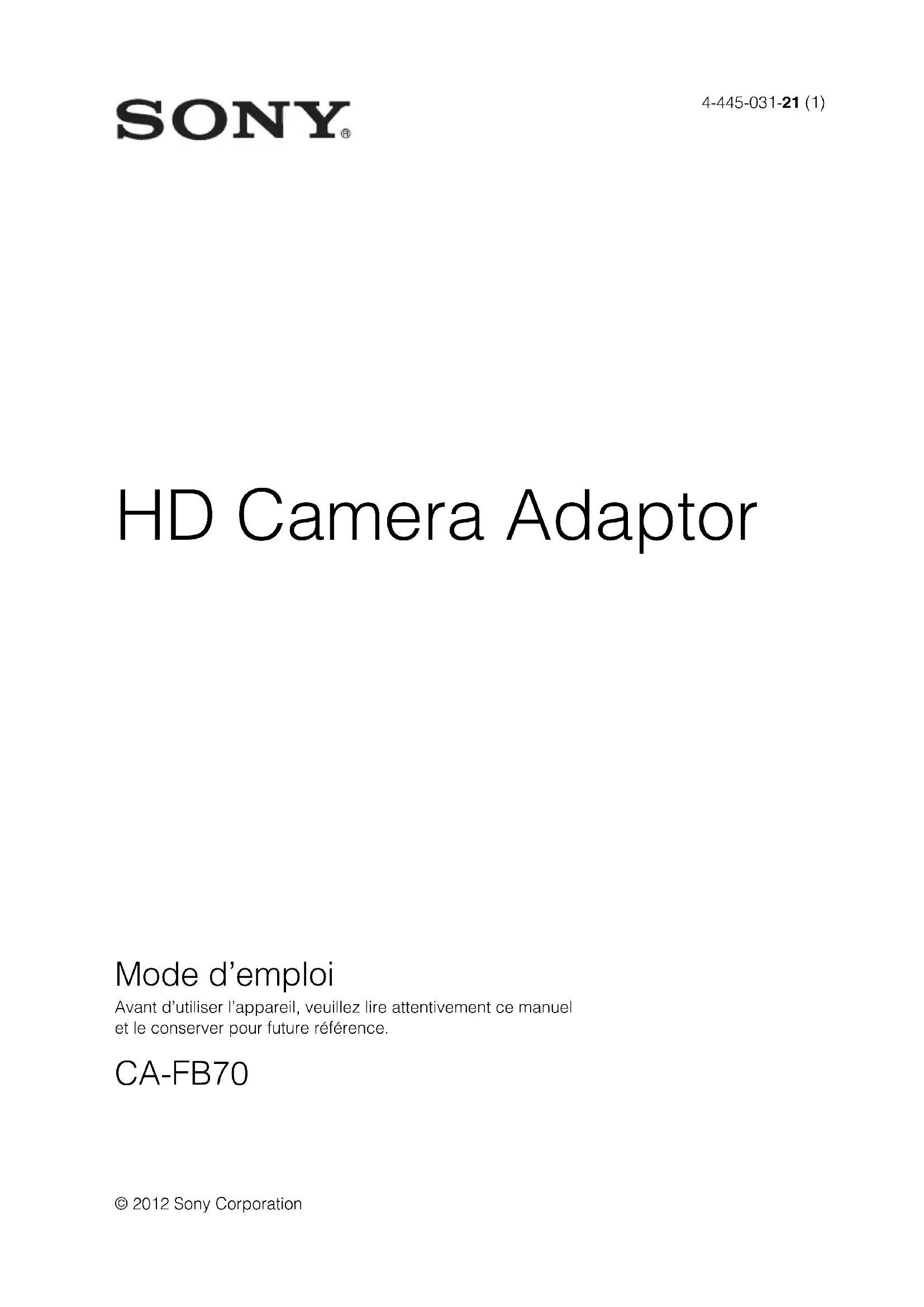 L'adaptateur deamera HD CA-FB70 est un adaptateur deamera fixé à laamera couleur HD HXC-D70 ou au caméscope à mémoire à semiconducteurs PMW-500/350/320. Il est possible de le raccorder à l'unité de contrôle deamera HD (CCU - Camera Control Unit) HXCU-FB70 à l'aide d'un cable à fibres optiques afin de transmettre des signaux video de haute qualité sur une longue distance entre l'adaptateur et la CCU.