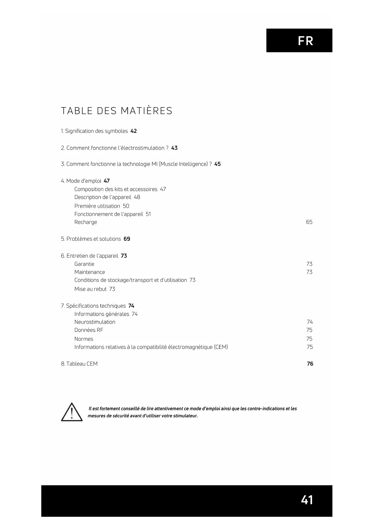 Il est fortement conseillé de lire attentivement ce mode d’emploi ainsi que les contre-indications et les mesures de sécurité avant d’utiliser votre stimulateur.