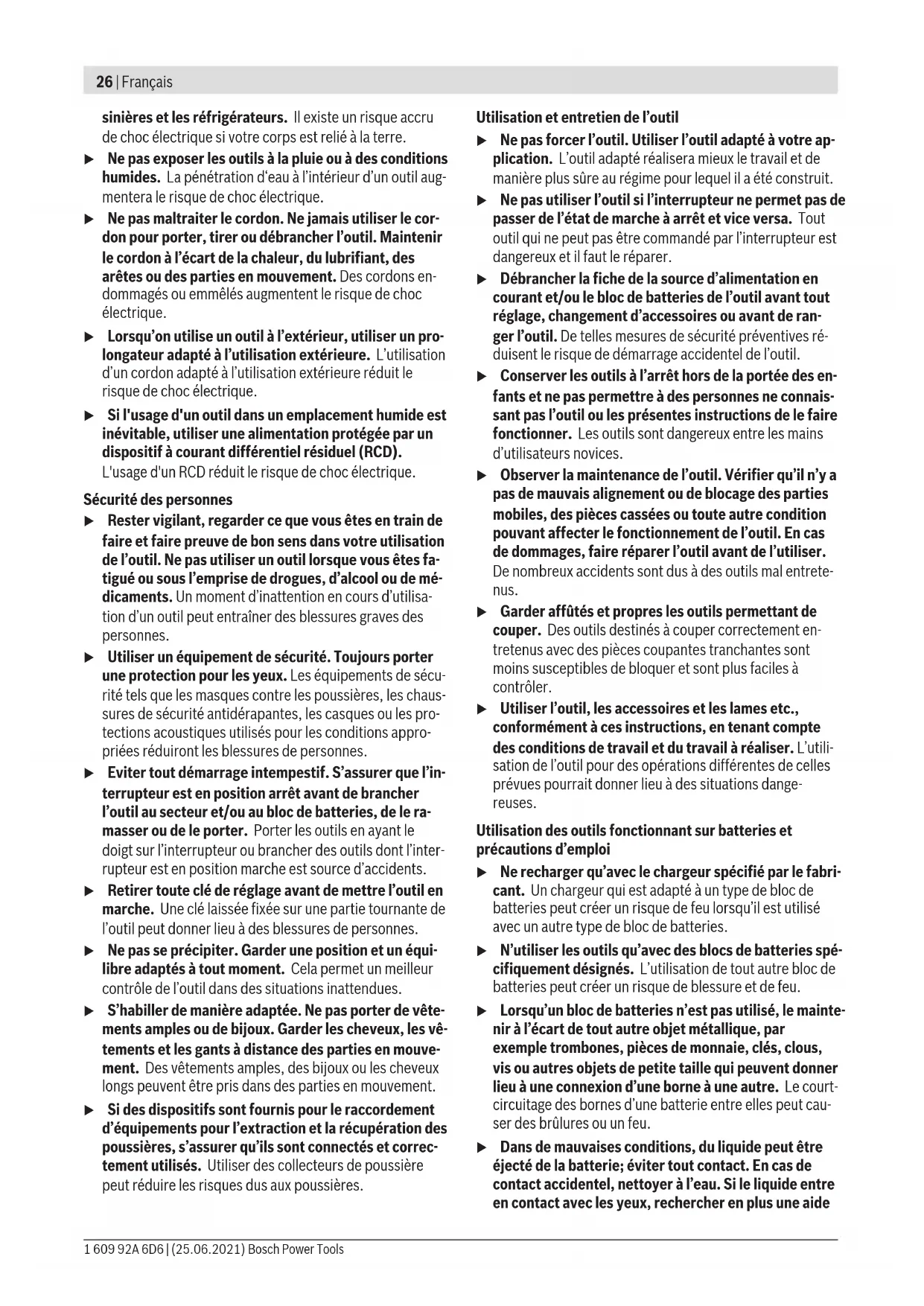 75 30 M 14 11 500 45 Aspiration de poussières/de copeaux Les poussières de matériaux tels que peintures contenant du plomb, certains bois, minéraux ou métaux, peuvent être nui- sibles à la santé. Entrer en contact ou aspirer les poussières peut entraîner des réactions allergiques et/ou des maladies respiratoires auprès de l’utilisateur ou de personnes se trou- vant à proximité. Certaines poussières telles que les poussières de chêne ou de hêtre sont considérées comme cancérigènes, surtout en association avec des additifs pour le traitement du bois (chromate, lazure). Les matériaux contenant de l’amiante ne doivent être travaillés que par des personnes qualifiées. – Veillez à bien aérer la zone de travail. – Il est recommandé de porter un masque respiratoire avec un niveau de filtration de classe P2. Respectez les règlements spécifiques aux matériaux à traiter en vigueur dans votre pays. u Évitez toute accumulation de poussières sur le lieu de travail. Les poussières peuvent facilement s’enflammer. Mise en marche Mise en marche Mise en place de l’accu Introduisez l’accu chargé (6) dans la base de l’outil électro- portatif jusqu’à ce que l’accu soit bien verrouillé. Mise en marche/arrêt Pour mettre en marche l’outil électroportatif, poussez l’in- terrupteur Marche/Arrêt (4) vers l’avant. Pour bloquer l’interrupteur Marche/Arrêt (4), appuyez sur l’interrupteur Marche/Arrêt (4) jusqu’à ce qu’il s’enclenche. Pour arrêter l’outil électroportatif, relâchez l’interrupteur Marche/Arrêt (4) ou, s’il a été bloqué, appuyez brièvement sur la partie arrière de l’interrupteur Marche/Arrêt (4), puis relâchez ce dernier. u Vérifiez les accessoires de meulage avant de les utili- ser. L’accessoire de meulage doit être correctement monté et doit pouvoir tourner librement. Effectuez une marche d’essai en faisant tourner l’outil à vide pendant au moins 1 minute. N’utilisez jamais des ac- cessoires de meulage qui sont endommagés, qui vibrent ou dont la rotation est irrégulière. Les acces- soires de meulage endommagés peuvent éclater et causer des blessures. Protection anti-redémarrage La protection anti-redémarrage évite le démarrage incontrô- lé de l’outil électroportatif après une coupure de courant. Pour remettre en marche l’outil électroportatif, placez l’in- terrupteur Marche/Arrêt (4) dans la position arrêt et redé- marrez l’outil électroportatif. Constante électronique La constante électronique permet de maintenir presque constante la vitesse de rotation en marche à vide et en charge, et assure ainsi une performance régulière. Démarrage progressif La fonction démarrage progressif limite le couple lors de la mise en marche et augmente la durée de vie du moteur. Bosch Power Tools 1 609 92A 6D6 | (25.06.2021)34 | Français Présélection de vitesse de rotation La molette de présélection de vitesse (7) permet de sélec- tionner la vitesse de rotation nécessaire (même durant l’utili- sation de l’outil). Le tableau ci-dessous indique les valeurs recommandées pour différentes applications. Matériau Application Accessoire de travail Position de la molette Métal Décapage de peinture Plateau de ponçage avec disque abrasif 2 − 3 Bois, métal Brossage, dérouillage Meule boisseau, disque abrasif 3 Métal, pierre Meulage Meule 4 − 6 Métal Ébarbage Meule 6 Métal Tronçonnage Disque à tronçonner 6 Pierre Tronçonnage Disque à tronçonner diamanté et glissière de guidage (l’utilisation d’une glissière de guidage est obligatoire pour le tronçonnage de matières minérales)