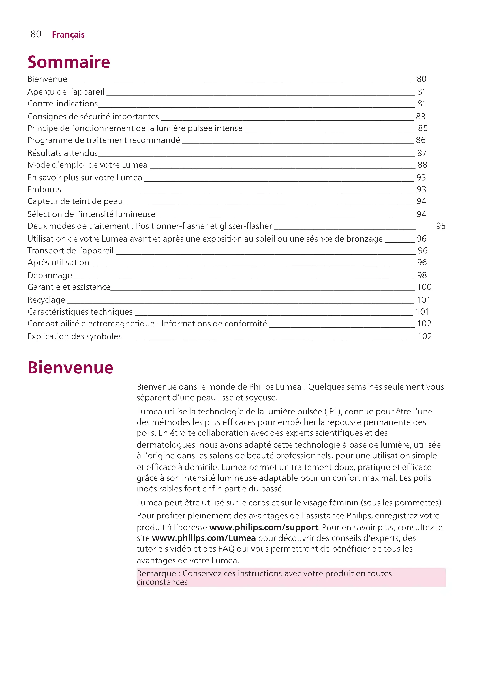 Français Sommaire Bienvenue_________________________________________________________________________________ 80 Aperçu de l’appareil ________________________________________________________________________ 81 Contre-indications__________________________________________________________________________ 81 Consignes de sécurité importantes ___________________________________________________________ 83 Principe de fonctionnement de la lumière pulsée intense ________________________________________ 85 Programme de traitement recommandé ______________________________________________________ 86 Résultats attendus__________________________________________________________________________ 87 Mode d’emploi de votre Lumea ______________________________________________________________ 88 En savoir plus sur votre Lumea _______________________________________________________________ 93 Embouts __________________________________________________________________________________ 93 Capteur de teint de peau____________________________________________________________________ 94 Sélection de l’intensité lumineuse ____________________________________________________________ 94 Deux modes de traitement: Positionner-flasher et glisser-flasher _________________________________ 95 Utilisation de votre Lumea avant et après une exposition au soleil ou une séance de bronzage _______ 96 Transport de l’appareil ______________________________________________________________________ 96 Après utilisation____________________________________________________________________________ 96 Dépannage________________________________________________________________________________ 98 Garantie et assistance_______________________________________________________________________ 100 Recyclage _________________________________________________________________________________ 101 Caractéristiques techniques _________________________________________________________________ 101 Compatibilité électromagnétique - Informations de conformité __________________________________ 102 Explication des symboles ____________________________________________________________________ 102 Bienvenue Bienvenue dans le monde de Philips Lumea! Quelques semaines seulement vous séparent d’une peau lisse et soyeuse. Lumea utilise la technologie de la lumière pulsée (IPL), connue pour être l’une des méthodes les plus efficaces pour empêcher la repousse permanente des poils. En étroite collaboration avec des experts scientifiques et des dermatologues, nous avons adapté cette technologie à base de lumière, utilisée à l’origine dans les salons de beauté professionnels, pour une utilisation simple et efficace à domicile. Lumea permet un traitement doux, pratique et efficace grâce à son intensité lumineuse adaptable pour un confort maximal. Les poils indésirables font enfin partie du passé. Lumea peut être utilisé sur le corps et sur le visage féminin (sous les pommettes). Pour profiter pleinement des avantages de l’assistance Philips, enregistrez votre produit à l’adresse www.philips.com/support. Pour en savoir plus, consultez le site www.philips.com/Lumea pour découvrir des conseils d'experts, des tutoriels vidéo et des FAQ qui vous permettront de bénéficier de tous les avantages de votre Lumea. Remarque: Conservez ces instructions avec votre produit en toutes circonstances.81 Français Aperçu de l’appareil 1 Verre filtrant (avec filtreUV intégré) 2 Embouts a Embout pour le corps b Embout pour le visage (SC1997, SC1998 et SC1999) c Embout maillot (SC1998, SC1999) 3 Réflecteur intégré à l'embout 4 Système de sécurité intégré 5 Capteur de teint de peau 6 Contacts électroniques 7 Bouton Flash 8 Accès aux contacts électroniques 9 Bouton marche/arrêt et de réglage de l’intensité lumineuse 10 Voyants d’intensité 11 Voyant «PRÊT à flasher» 12 Fentes de ventilation 13 Prise de l'appareil 14 Adaptateur 15 Petite fiche 16 Trousse (non illustrée) 17 Tissu nettoyant (non illustré) Contre-indications Conditions d’utilisation N’utilisez jamais l’appareil: