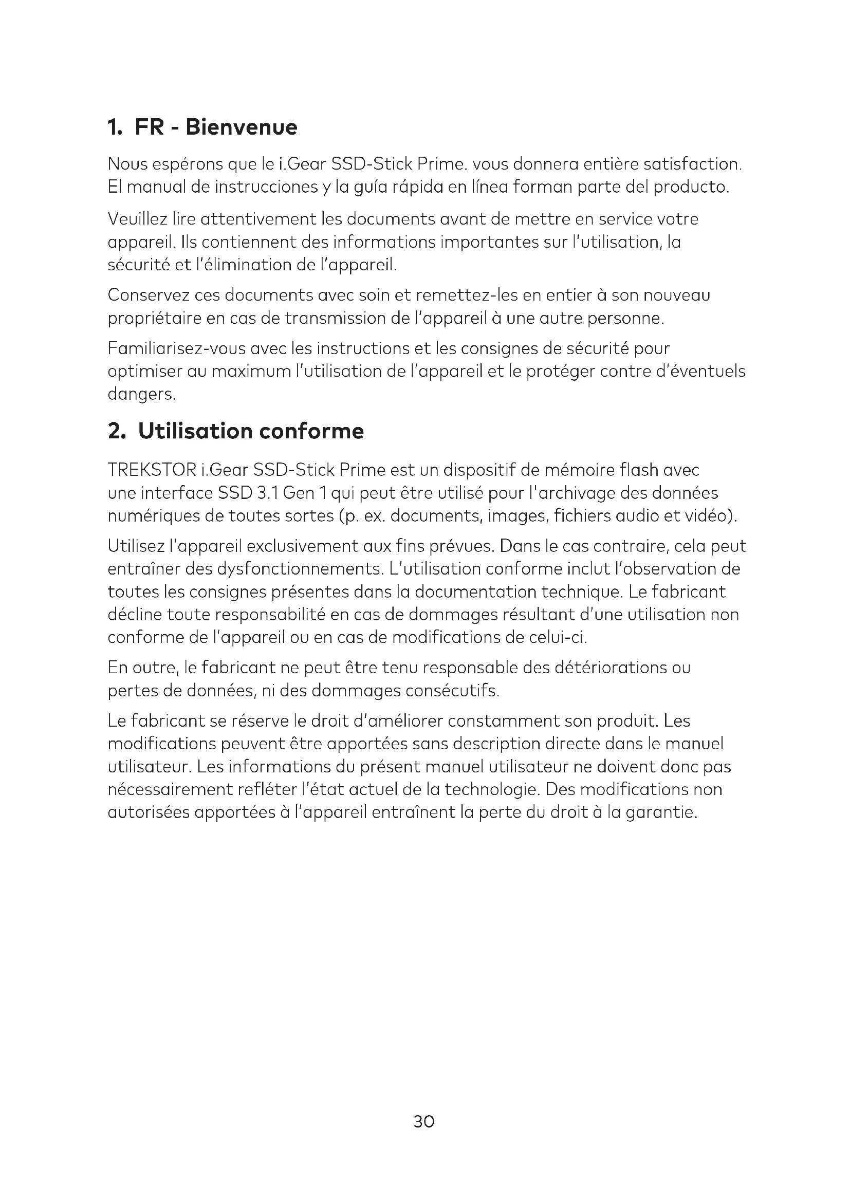 TREKSTOR i.Gear SSD-Stick Prime est un dispositif de mémoire lash avec une interface SSD 3.1 Gen 1 qui peut être utilisé pour l'archivage des données numériques de toutes sortes (p. ex. documents, images, ichiers audio et vidéo). Utilisez l’appareil exclusivement aux ins prévues. Dans le cas contraire, cela peut entraîner des dysfonctionnements. L’utilisation conforme inclut l’observation de toutes les consignes présentes dans la documentation technique. Le fabricant décline toute responsabilité en cas de dommages résultant d’une utilisation non conforme de l’appareil ou en cas de modiications de celui-ci. En outre, le fabricant ne peut être tenu responsable des détériorations ou pertes de données, ni des dommages consécutifs. Le fabricant se réserve le droit d’améliorer constamment son produit. Les modiications peuvent être apportées sans description directe dans le manuel utilisateur. Les informations du présent manuel utilisateur ne doivent donc pas nécessairement reléter l’état actuel de la technologie. Des modiications non autorisées apportées à l’appareil entraînent la perte du droit à la garantie.31