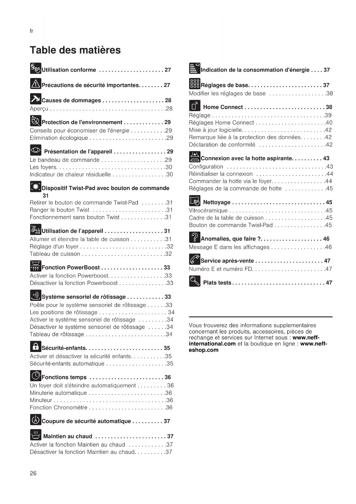 - E Plats tests Produktinfo Vous trouverez des informations supplementaires concernant les produits, accessoires, pièces de rechange et services sur Internet sous : www.neff- international.com et la boutique en ligne : www.neff- eshop.comUtilisation conforme fr p. 47