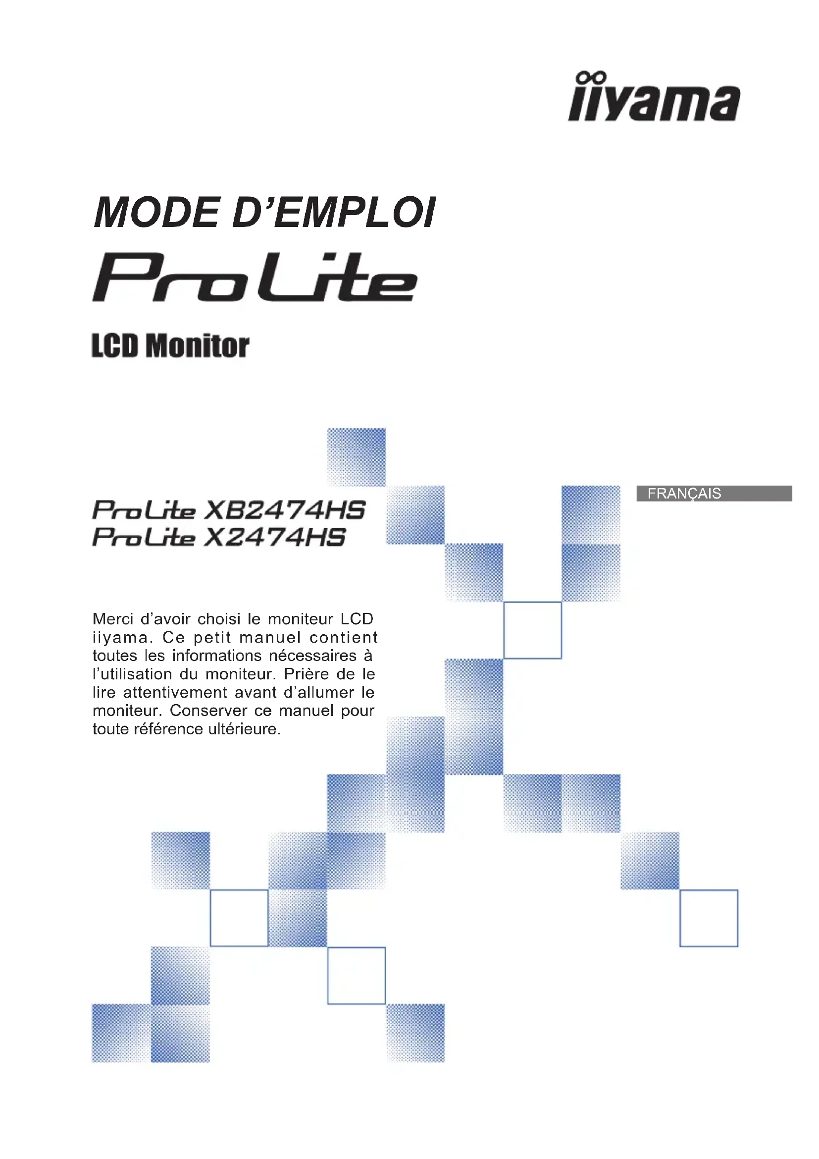 Merci d’avoir choisi le moniteur LCD iiyama. Ce petit manuel contient toutes les informations nécessaires à l’utilisation du moniteur. Prière de le lire attentivement avant d’allumer le moniteur. Conserver ce manuel pour toute référence ultérieure.FRANÇAIS