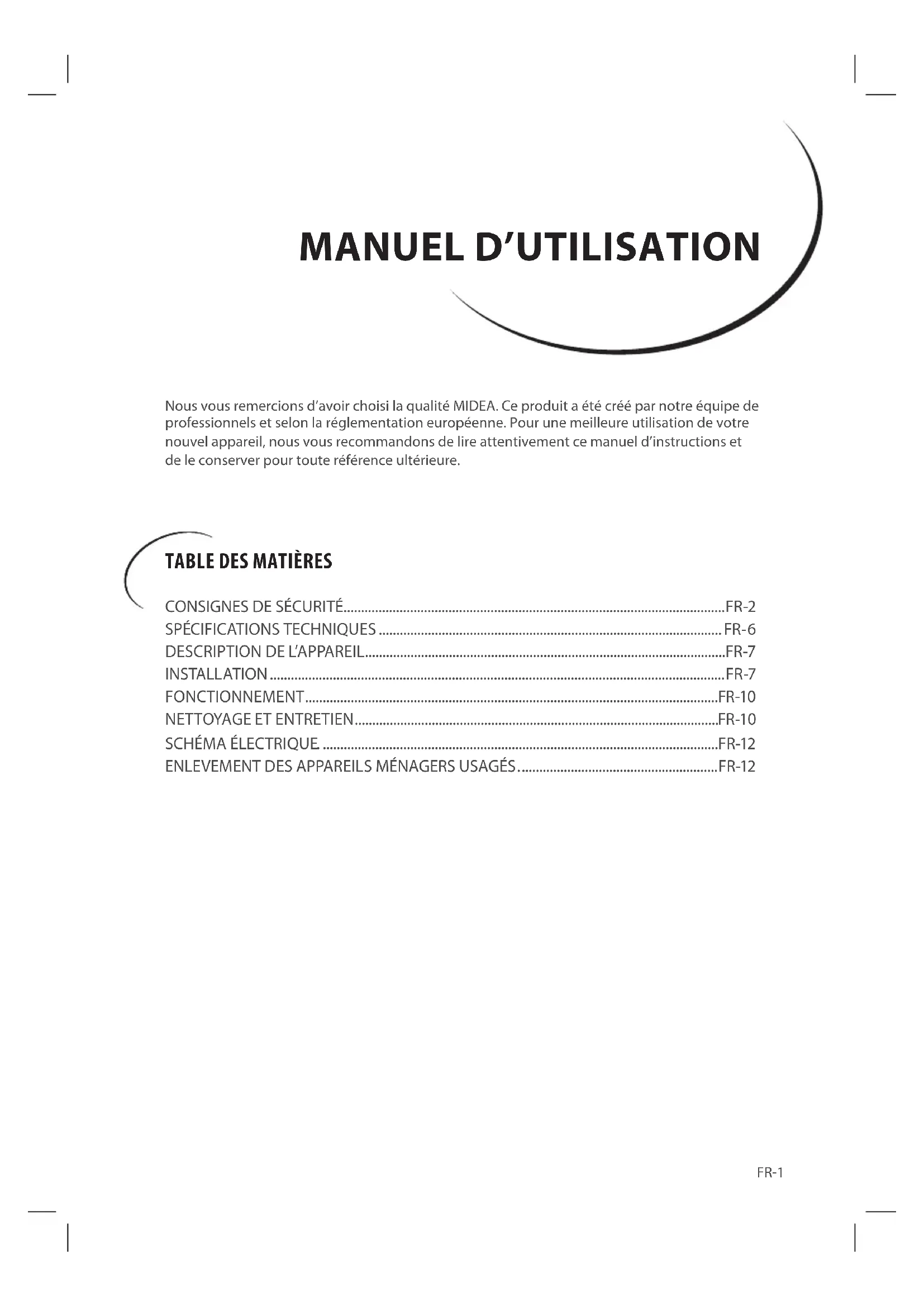 FR-1 Nous vous remercions d’avoir choisi la qualité MIDEA. Ce produit a été créé par notre équipe de professionnels et selon la réglementation européenne. Pour une meilleure utilisation de votre nouvel appareil, nous vous recommandons de lire attentivement ce manuel d’instructions et de le conserver pour toute référence ultérieure.