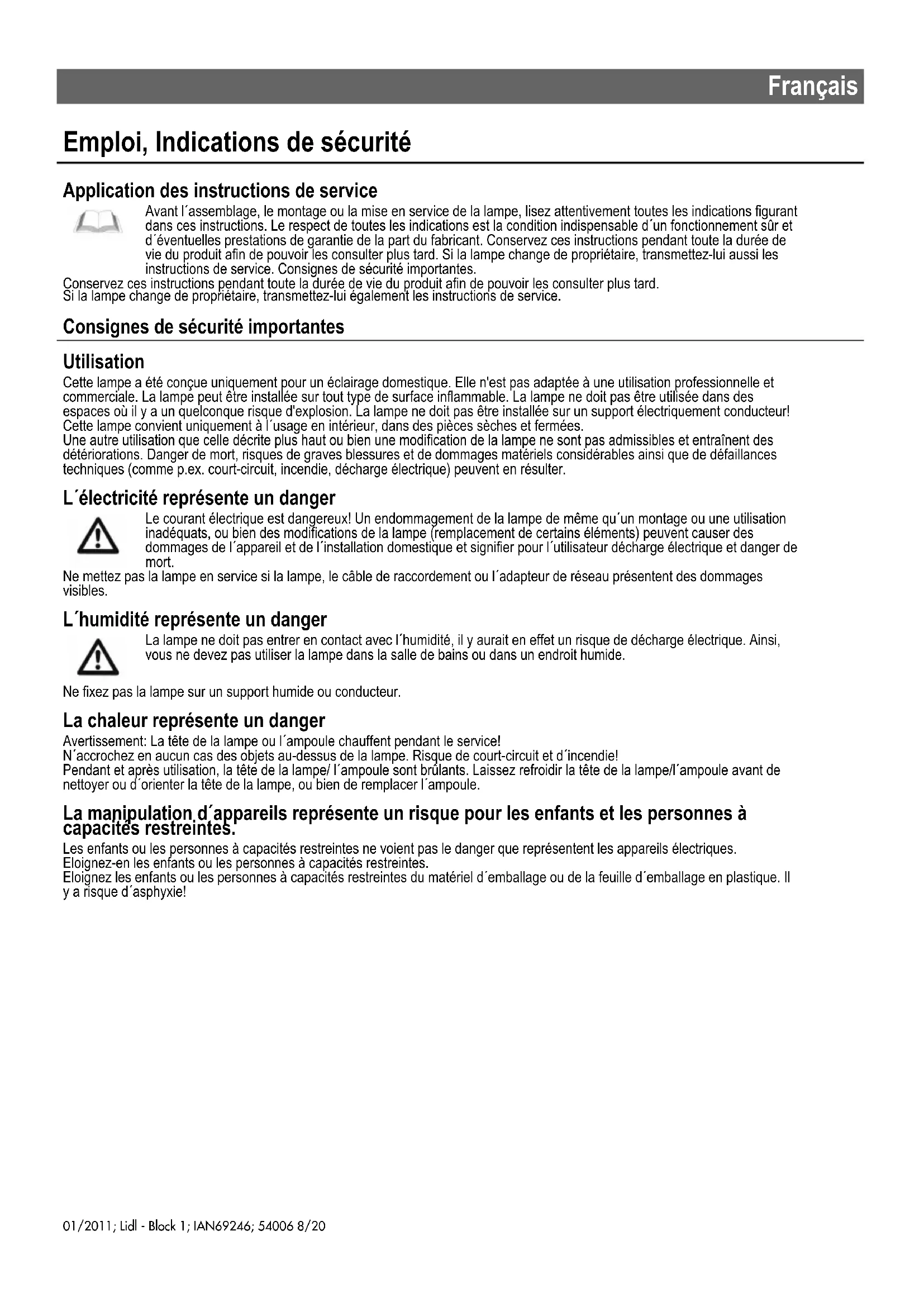 01/2011; Lidl - Block 1; IAN69246; 540067/20Français Emploi, Indications de sécurité Application des instructions de service Avant l´assemblage, le montage ou la mise en service de la lampe, lisez attentivement toutes les indications figurant dans ces instructions. Le respect de toutes les indications est la condition indispensable d´un fonctionnement sûr et d´éventuelles prestations de garantie de la part du fabricant. Conservez ces instructions pendant toute la durée de vie du produit afin de pouvoir les consulter plus tard. Si la lampe change de propriétaire, transmettez-lui aussi les instructions de service. Consignes de sécurité importantes. Conservez ces instructions pendant toute la durée de vie du produit afin de pouvoir les consulter plus tard. Si la lampe change de propriétaire, transmettez-lui également les instructions de service. Consignes de sécurité importantes Utilisation Cette lampe a été conçue uniquement pour un éclairage domestique. Elle n'est pas adaptée à une utilisation professionnelle et commerciale. La lampe peut être installée sur tout type de surface inflammable. La lampe ne doit pas être utilisée dans des espaces où il y a un quelconque risque d'explosion. La lampe ne doit pas être installée sur un support électriquement conducteur! Cette lampe convient uniquement à l´usage en intérieur, dans des pièces sèches et fermées. Une autre utilisation que celle décrite plus haut ou bien une modification de la lampe ne sont pas admissibles et entraînent des détériorations. Danger de mort, risques de graves blessures et de dommages matériels considérables ainsi que de défaillances techniques (comme p.ex. court-circuit, incendie, décharge électrique) peuvent en résulter. L´électricité représente un danger Le courant électrique est dangereux! Un endommagement de la lampe de même qu´un montage ou une utilisation inadéquats, ou bien des modifications de la lampe (remplacement de certains éléments) peuvent causer des dommages de l´appareil et de l´installation domestique et signifier pour l´utilisateur décharge électrique et danger de mort. Ne mettez pas la lampe en service si la lampe, le câble de raccordement ou l´adapteur de réseau présentent des dommages visibles. L´humidité représente un danger La lampe ne doit pas entrer en contact avec l´humidité, il y aurait en effet un risque de décharge électrique. Ainsi, vous ne devez pas utiliser la lampe dans la salle de bains ou dans un endroit humide. Ne fixez pas la lampe sur un support humide ou conducteur. La chaleur représente un danger